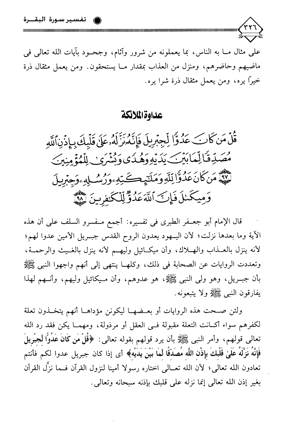 قال الإمام أبو جعفر الطبري في تفسيره: أجمع مفسرو السلف على أن هذه الآية وما بعدها نزلت، لأن اليهود يعدون الروح القدس جبريل الأمين عدوا لهم، لأنه ينزل بالعذاب والهلاك، وأن ميكائيل وليهم لأنه ينزل بالغيث والرحمة، وتعددت الروايات عن الصحابة في ذلك، وكلها ينتهي إلى أنهم واجهوا النبي - صلى الله عليه وسلم - بأن جبريل، وهو ولي النبي - صلى الله عليه وسلم -، هو عدوهم، وأن ميكائيل وليهم، وأنهم لهذا يفارقون النبي - صلى الله عليه وسلم - ولا يتبعونه.
