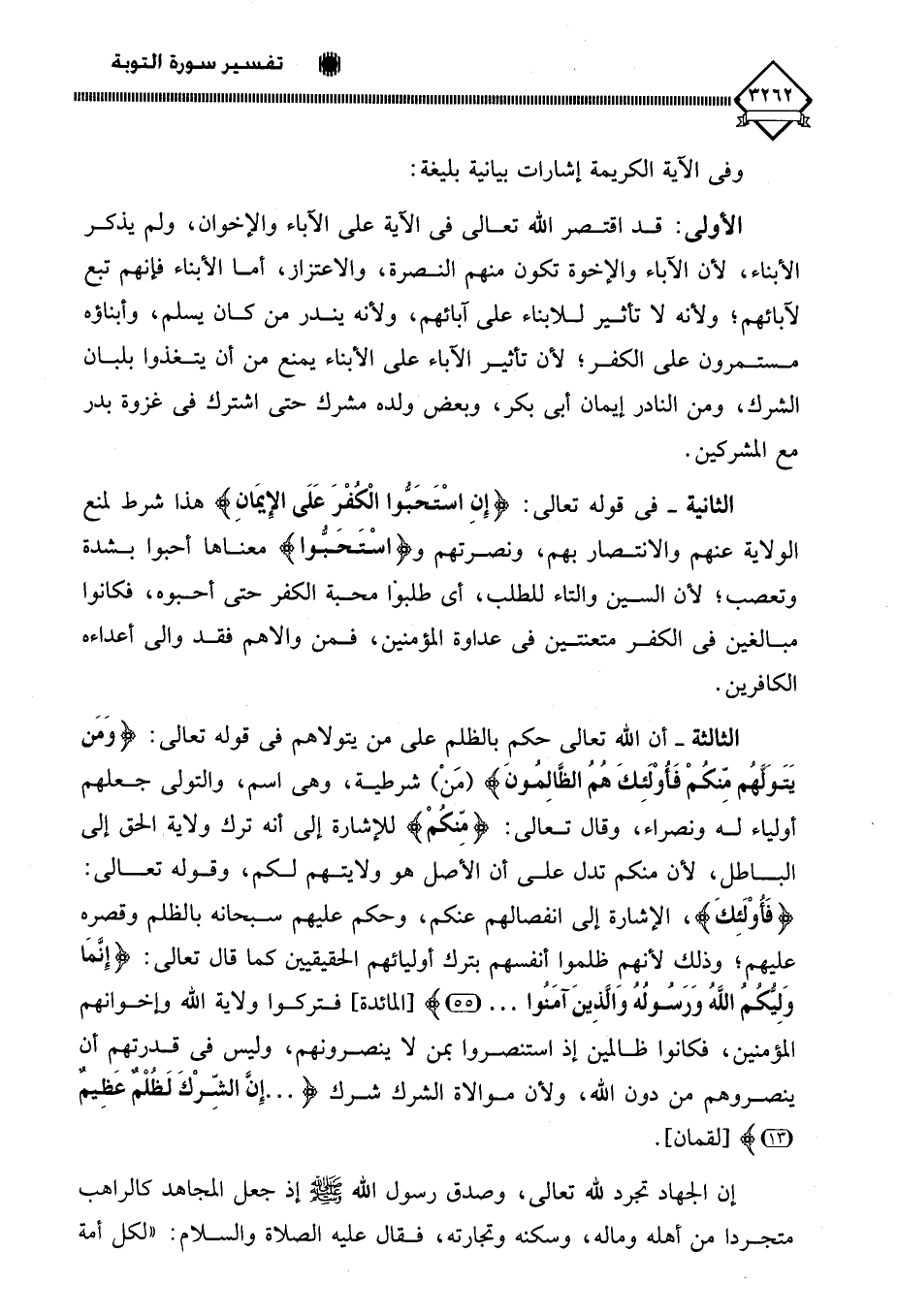الثالثة - أن الله تعالى حكمِ بالظلم على من يتولاهم في قوله تعالى: (وَمَن يَتَوَلَهُم مِّنكمْ فَأوْلَئِكَ هُم الظَّالِمُون) (مَنْ) شرطية، وهي اسم، والتولي جعلهم أولياء له ونصراء، وقال تعالى: (مِنكمْ) للإشارة إلى أنه ترك ولاية الحق إلى الباطل، لأن منكم تدل على أن الأصل هو ولايتهم لكم، وقوله تعالى: (فَأُوْلَئِكَ)، الإشارة إلى انفصالهم عنكم، وحكم عليهم سبحانه بالظلم وقصره عليهم؛ وذلك لأنهم ظلموا أنفسهم بترك أوليائهم الحقيقيين كما قال تعالى: (إِنَّمَا وَلِيُّكُمُ اللَّه وَرَسُولهُ وَالَّذِينَ آمَنُوا. . .)، فإركوا ولاية الله وإخوانهم المؤمنين، فكانوا ظالمين إذ استنصروا بمن لَا ينصرونهم، وليس في قدرتهم أن ينصروهم من دون الله، ولأن موالاة الشرك شرك (. . . إِنَّ الشِّرْكَ لَظُلْمٌ عَظِيمٌ). إن الجهاد تجرد لله تعالى، وصدق رسول الله - صلى الله عليه وسلم - إذ جعل المجاهد كالراهب متجردا من أهله وماله، وسكنه وتجارته، فقال عليه الصلاة والسلام: " لكل أمة