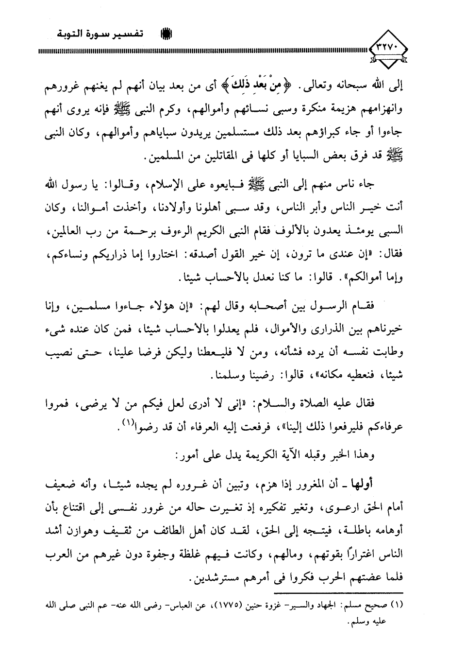 أولها - أن المغرور إذا هزم، وتبين أن غروره لم يجده شيئا، وأنه ضعيف أمام الحق ارعوى، وتغير تفكيره إذ تغيرت حاله من غرور نفسي إلى اقتناع بأن أوهامه باطلة، فيتجه إلى الحق، لقد كان أهل الطائف من ثقيف وهوازن أشد الناس اغترارًا بقوتهم، ومالهم، وكانت فيهم غلظة وجفوة دون غيرهم من العرب فلما عضتهم الحرب فكروا في أمرهم مسترشدين.