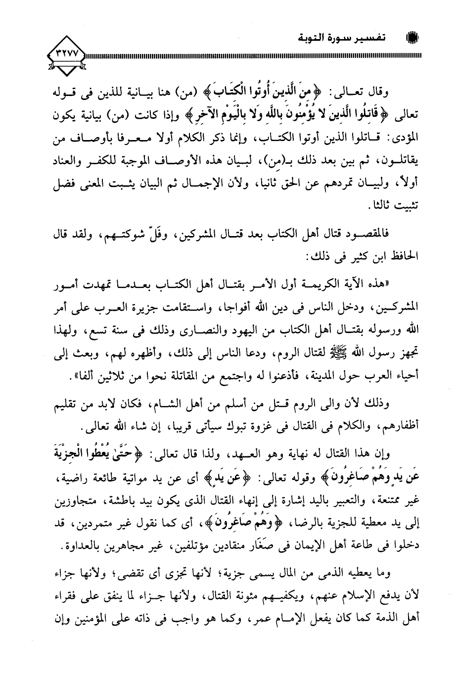" هذه الآية الكريمة أول الأمر بقتال أهل الكتاب بعدما تمهدت أمور المشركين، ودخل الناس في دين الله أفواجا، واستقامت جزيرة العرب على أمر الله ورسوله بقتال أهل الكتاب من اليهود والنصارى وذلك في سنة تسع، ولهذا تجهز رسول الله - صلى الله عليه وسلم - لقتال الروم، ودعا الناس إلى ذلك، وأظهره لهم، وبعث إلى أحياء العرب حول المدينة، فأذعنوا له واجتمع من المقاتلة نحوا من ثلاثين ألفا ".