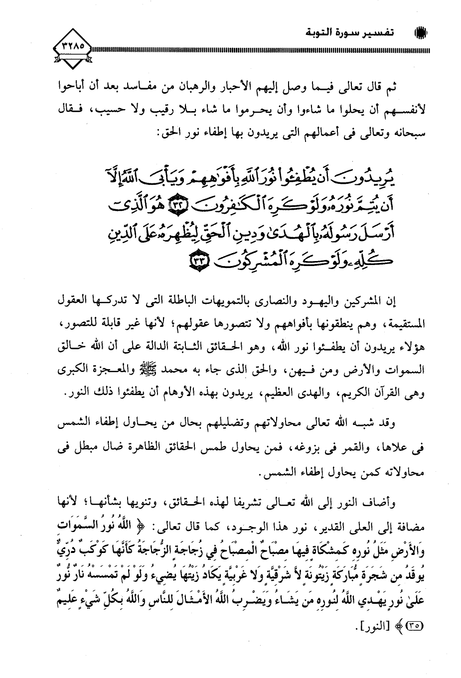 (يُرِيدُونَ أَنْ يُطْفِئُوا نُورَ اللَّهِ بِأَفْوَاهِهِمْ وَيَأْبَى اللَّهُ إِلَّا أَنْ يُتِمَّ نُورَهُ وَلَوْ كَرِهَ الْكَافِرُونَ (32) هُوَ الَّذِي أَرْسَلَ رَسُولَهُ بِالْهُدَى وَدِينِ الْحَقِّ لِيُظْهِرَهُ عَلَى الدِّينِ كُلِّهِ وَلَوْ كَرِهَ الْمُشْرِكُونَ (33)