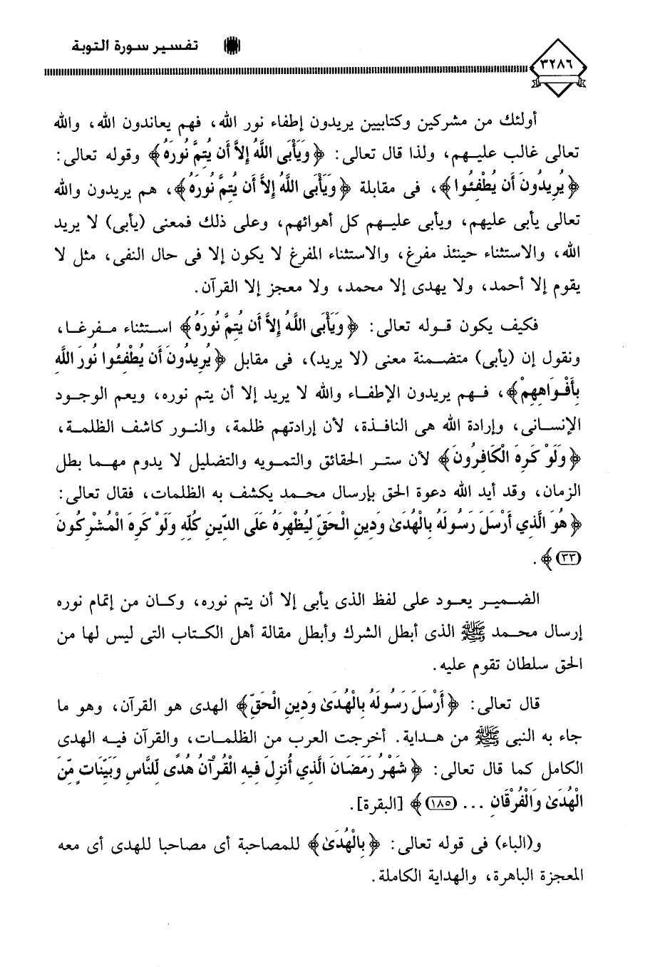 أولئك من مشركين وكتابيين يريدون إطفاء نور الله، فهم يعاندون الله، والله تعالى غالب عليهم، ولذا قال تعالى: (وَيَأبَى اللَّهُ إِلَّا أَن يُتِمَّ نُورَهُ) وقوله تعالى: (يُرِيدُونَ أَن يُطْفِئُوا)، في مقابلة (وَيَأبَى اللَّهُ إِلَّا أَن يتِمَّ نُورَهُ)، هم يريدون والله تعالى يأبى عليهم، ويأبى عليهم كل أهوائهم، وعلى ذلك فمعنى (يأبى) لَا يريد الله، والاستثناء حينئذ مفرغ، والاستثناء المفرغ لَا يكون إلا في حال النفي، مثل لا يقوم إلا أحمد، ولا يهدي إلا محمد، ولا معجز إلا القرآن.