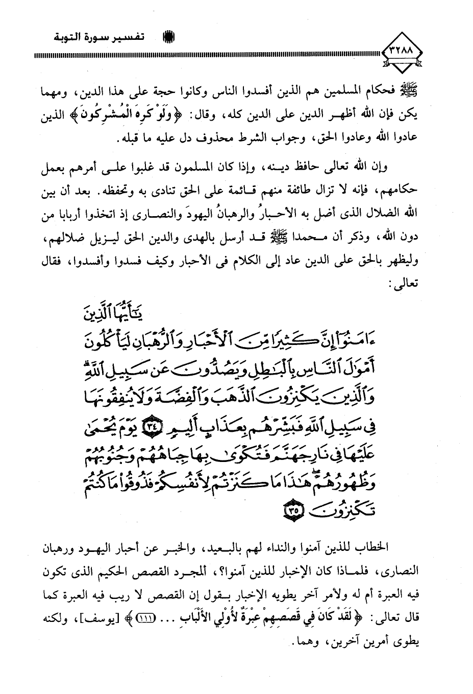 (يَا أَيُّهَا الَّذِينَ آمَنُوا إِنَّ كَثِيرًا مِنَ الْأَحْبَارِ وَالرُّهْبَانِ لَيَأْكُلُونَ أَمْوَالَ النَّاسِ بِالْبَاطِلِ وَيَصُدُّونَ عَنْ سَبِيلِ اللَّهِ وَالَّذِينَ يَكْنِزُونَ الذَّهَبَ وَالْفِضَّةَ وَلَا يُنْفِقُونَهَا فِي سَبِيلِ اللَّهِ فَبَشِّرْهُمْ بِعَذَابٍ أَلِيمٍ (34) يَوْمَ يُحْمَى عَلَيْهَا فِي نَارِ جَهَنَّمَ فَتُكْوَى بِهَا جِبَاهُهُمْ وَجُنُوبُهُمْ وَظُهُورُهُمْ هَذَا مَا كَنَزْتُمْ لِأَنْفُسِكُمْ فَذُوقُوا مَا كُنْتُمْ تَكْنِزُونَ (35)