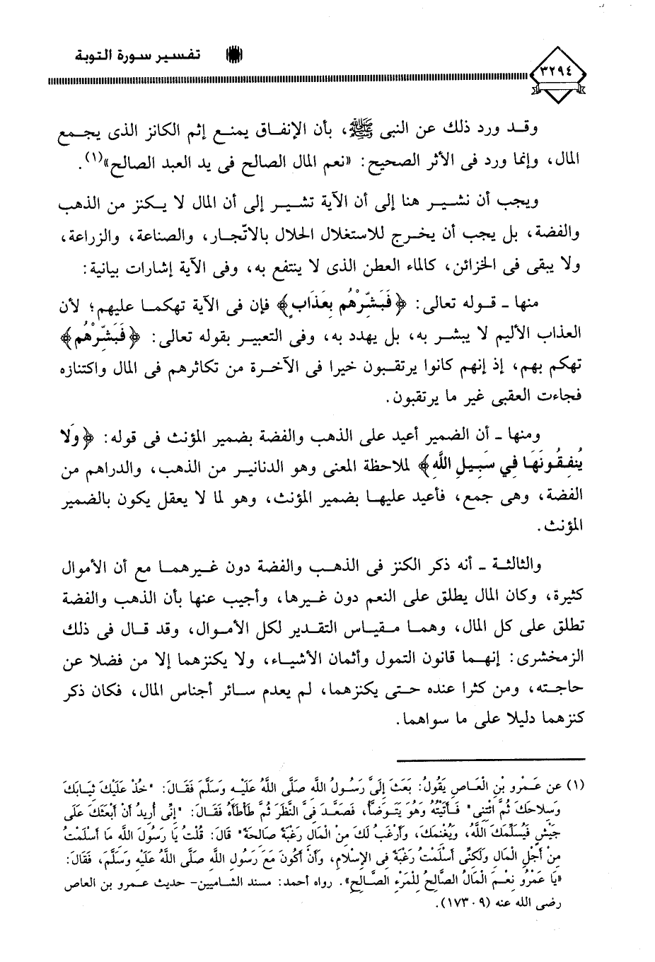 ويجب أن نشير هنا إلى أن الآية تشير إلى أن المال لَا يكنز من الذهب والفضة، بل يجب أن يخرج للاستغلال الحلال بالاتجار، والصناعة، والزراعة، ولا يبقى في الخزائن، كالماء العطن الذي لَا ينتفع به، وفي الآية إشارات بيانية: منها - قوله تعالى: (فَبَشِّرْهُم بِعَذَاب) فإن في الآية تهكما عليهم؛ لأن العذاب الأليم لَا يبشر به، بل يهدد به، وفي التعبير بقوله تعالى: (فَبَشِّرْهُم) تهكم بهم، إذ إنهم كانوا يرتقبون خيرا في الآخرة من تكاثرهم في المال واكتنازه فجاءت العقبى غير ما يرتقبون.