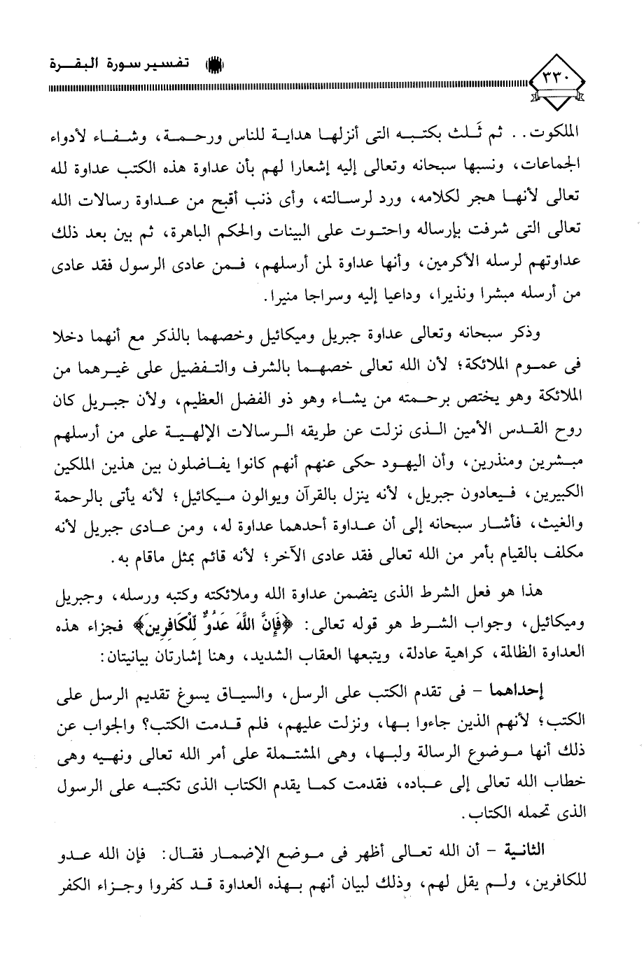هذا هو فعل الشرط الذي يتضمن عداوة الله وملائكته وكتبه ورسله، وجبريل وميكائيل، وجواب الشرط هو قوله تعالى: (فَإِنَّ اللَّهَ عَدُوٌّ لِلْكَافِرِينَ) فجزاء هذه العداوة الظالمة، كراهية عادلة، ويتبعها العقاب الشديد، وهنا إشارتان بيانيتان: إحداهما - في تقدم الكتب على الرسل، والسياق يسوغ تقديم الرسل على الكتب؛ لأنهم الذين جاءوا بها، ونزلت عليهم، فلم قدمت الكتب؛ والجواب عن ذلك أنها موضوع الرسالة ولبها، وهي المشتملة على أمر الله تعالى ونهيه وهي خطاب الله تعالى إلى عباده، فقدمت كما يقدم الكتاب الذي تكتبه على الرسول الذي تحمله الكتاب.