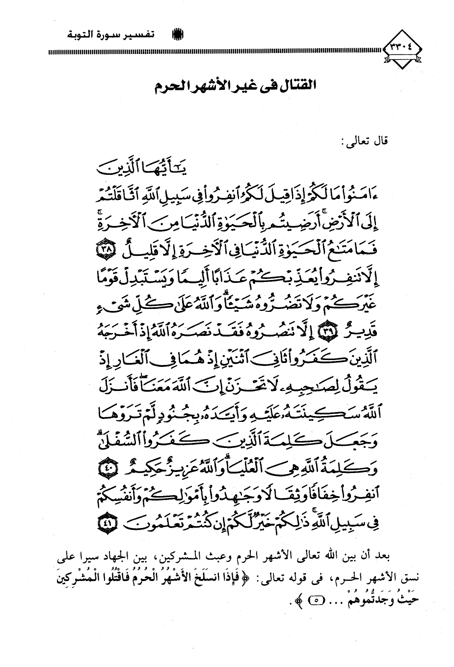 (يَا أَيُّهَا الَّذِينَ آمَنُوا مَا لَكُمْ إِذَا قِيلَ لَكُمُ انْفِرُوا فِي سَبِيلِ اللَّهِ اثَّاقَلْتُمْ إِلَى الْأَرْضِ أَرَضِيتُمْ بِالْحَيَاةِ الدُّنْيَا مِنَ الْآخِرَةِ فَمَا مَتَاعُ الْحَيَاةِ الدُّنْيَا فِي الْآخِرَةِ إِلَّا قَلِيلٌ (38) إِلَّا تَنْفِرُوا يُعَذِّبْكُمْ عَذَابًا أَلِيمًا وَيَسْتَبْدِلْ قَوْمًا غَيْرَكُمْ وَلَا تَضُرُّوهُ شَيْئًا وَاللَّهُ عَلَى كُلِّ شَيْءٍ قَدِيرٌ (39) إِلَّا تَنْصُرُوهُ فَقَدْ نَصَرَهُ اللَّهُ إِذْ أَخْرَجَهُ الَّذِينَ كَفَرُوا ثَانِيَ اثْنَيْنِ إِذْ هُمَا فِي الْغَارِ إِذْ يَقُولُ لِصَاحِبِهِ لَا تَحْزَنْ إِنَّ اللَّهَ مَعَنَا فَأَنْزَلَ اللَّهُ سَكِينَتَهُ عَلَيْهِ وَأَيَّدَهُ بِجُنُودٍ لَمْ تَرَوْهَا وَجَعَلَ كَلِمَةَ الَّذِينَ كَفَرُوا السُّفْلَى وَكَلِمَةُ اللَّهِ هِيَ الْعُلْيَا وَاللَّهُ عَزِيزٌ حَكِيمٌ (40) انْفِرُوا خِفَافًا وَثِقَالًا وَجَاهِدُوا بِأَمْوَالِكُمْ وَأَنْفُسِكُمْ فِي سَبِيلِ اللَّهِ ذَلِكُمْ خَيْرٌ لَكُمْ إِنْ كُنْتُمْ تَعْلَمُونَ (41)