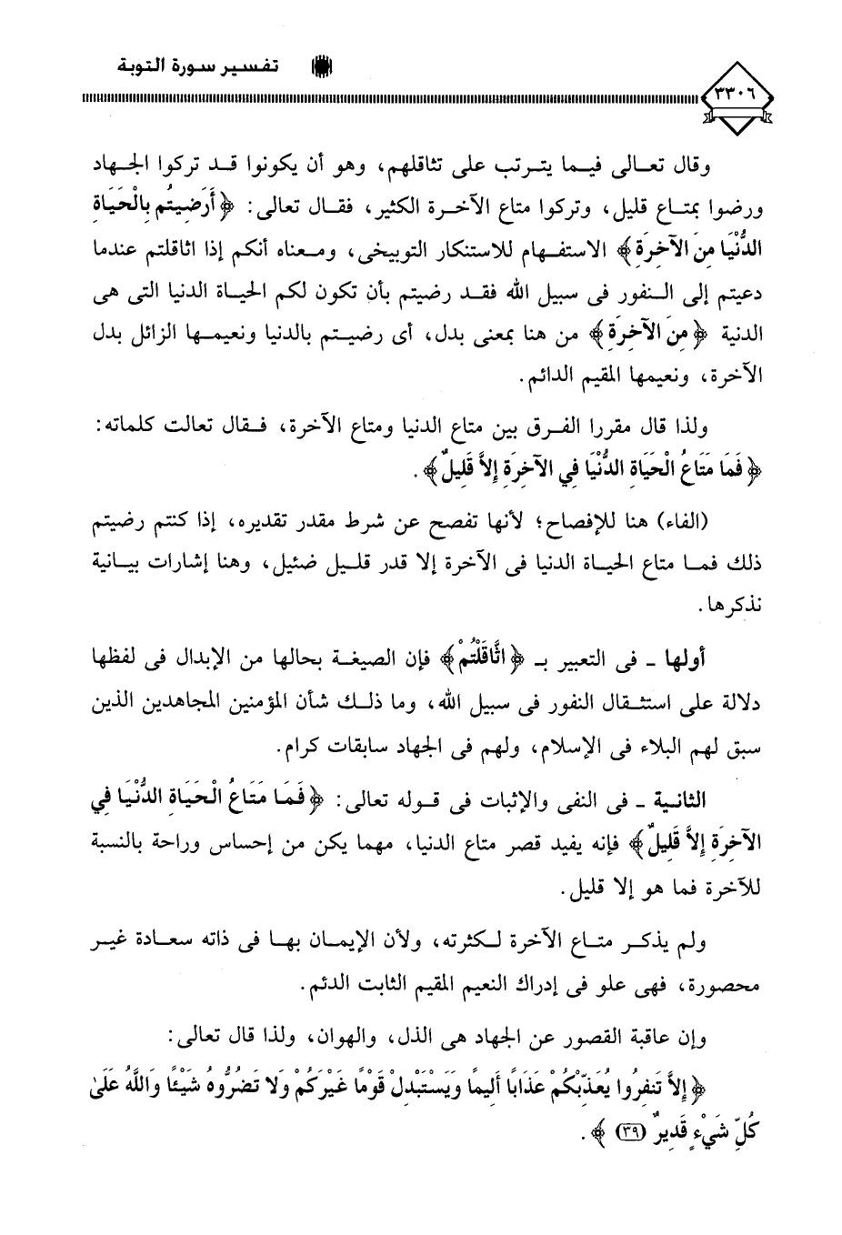 وقال تعالى فيما يترتب على تثاقلهم، وهو أن يكونوا قد تركوا الجهاد ورضوا بمتاع قليل، وتركوا متاع الآخرة الكثير، فقال تعالى: (أَرَضِيتُم بِالْحَيَاةِ الدُّنْيَا مِنَ الآخِرَةِ) الاستفهام للاستنكار التوبيخي، ومعناه أنكم إذا اثاقلتم عندما دعيتم إلى النفور في سبيل الله فقد رضيتم بأن تكون لكم الحياة الدنيا التي هي الدنية (مِنَ الآخِرَةِ) من هنا بمعنى بدل، أي رضيتم بالدنيا ونعيمها الزائل بدل الآخرة، ونعيمها المقيم الدائم.