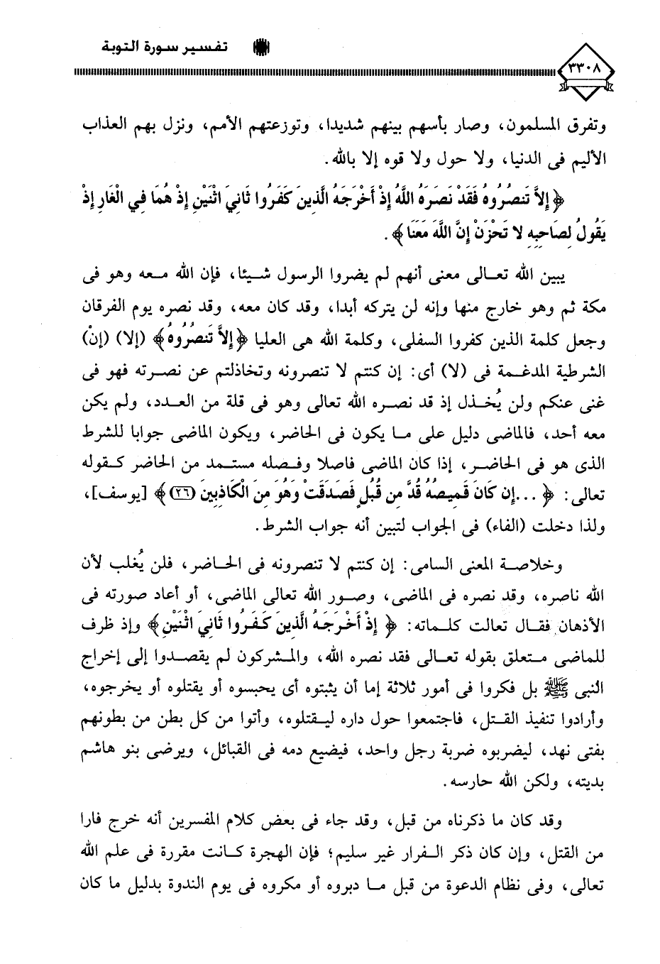 يبين الله تعالى معنى أنهم لم يضروا الرسول شيئا، فإن الله معه وهو في مكة ثم وهو خارج منها وإنه لن يتركه أبدا، وقد كان معه، وقد نصره يوم الفرقان وجعل كلمة الذين كفروا السفلى، وكلمة الله هي العليا (إِلَّا تَنْصُرُوهُ) (إلا) (إنْ) الشرطية المدغمة في (لا) أي: إن كنتم لَا تنصرونه وتخاذلتم عن نصرته فهو في غنى عنكم ولن يُخذل إذ قد نصره الله تعالى وهو في قلة من العدد، ولم يكن معه أحد، فالماضي دليل على ما يكون في الحاضر، ويكون الماضي جوابا للشرط الذي هو في الحاضر، إذا كان الماضي فاصلا وفصله مستمد من الحاضر كقوله تعالى: (. . . إِن كانَ قَمِيصُهُ قُدَّ مِن قُبُلٍ فَصَدَقَتْ وَهُوَ مِنَ الْكَاذِبِينَ).