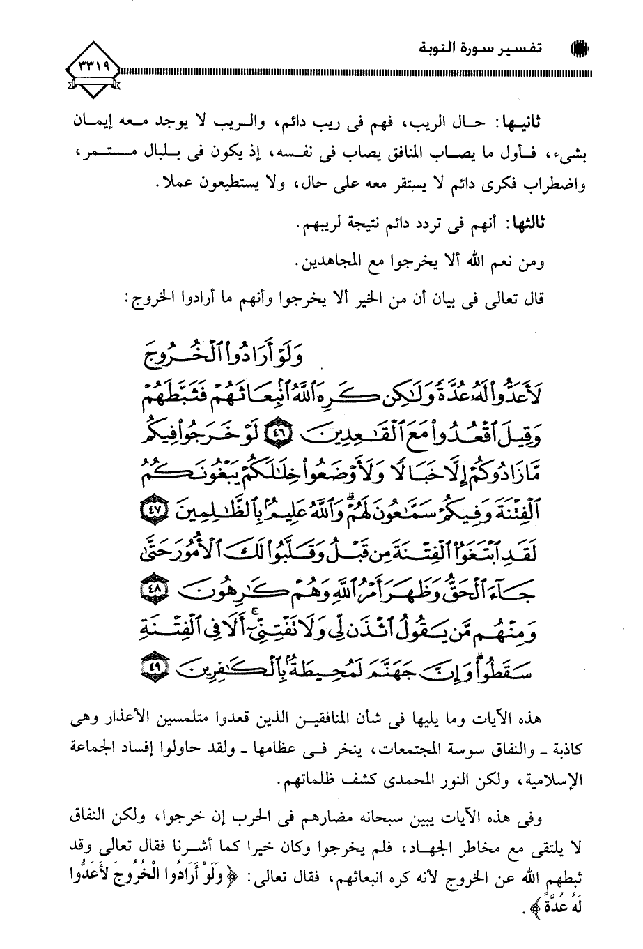 (وَلَوْ أَرَادُوا الْخُرُوجَ لَأَعَدُّوا لَهُ عُدَّةً وَلَكِنْ كَرِهَ اللَّهُ انْبِعَاثَهُمْ فَثَبَّطَهُمْ وَقِيلَ اقْعُدُوا مَعَ الْقَاعِدِينَ (46) لَوْ خَرَجُوا فِيكُمْ مَا زَادُوكُمْ إِلَّا خَبَالًا وَلَأَوْضَعُوا خِلَالَكُمْ يَبْغُونَكُمُ الْفِتْنَةَ وَفِيكُمْ سَمَّاعُونَ لَهُمْ وَاللَّهُ عَلِيمٌ بِالظَّالِمِينَ (47) لَقَدِ ابْتَغَوُا الْفِتْنَةَ مِنْ قَبْلُ وَقَلَّبُوا لَكَ الْأُمُورَ حَتَّى جَاءَ الْحَقُّ وَظَهَرَ أَمْرُ اللَّهِ وَهُمْ كَارِهُونَ (48) وَمِنْهُمْ مَنْ يَقُولُ ائْذَنْ لِي وَلَا تَفْتِنِّي أَلَا فِي الْفِتْنَةِ سَقَطُوا وَإِنَّ جَهَنَّمَ لَمُحِيطَةٌ بِالْكَافِرِينَ (49)