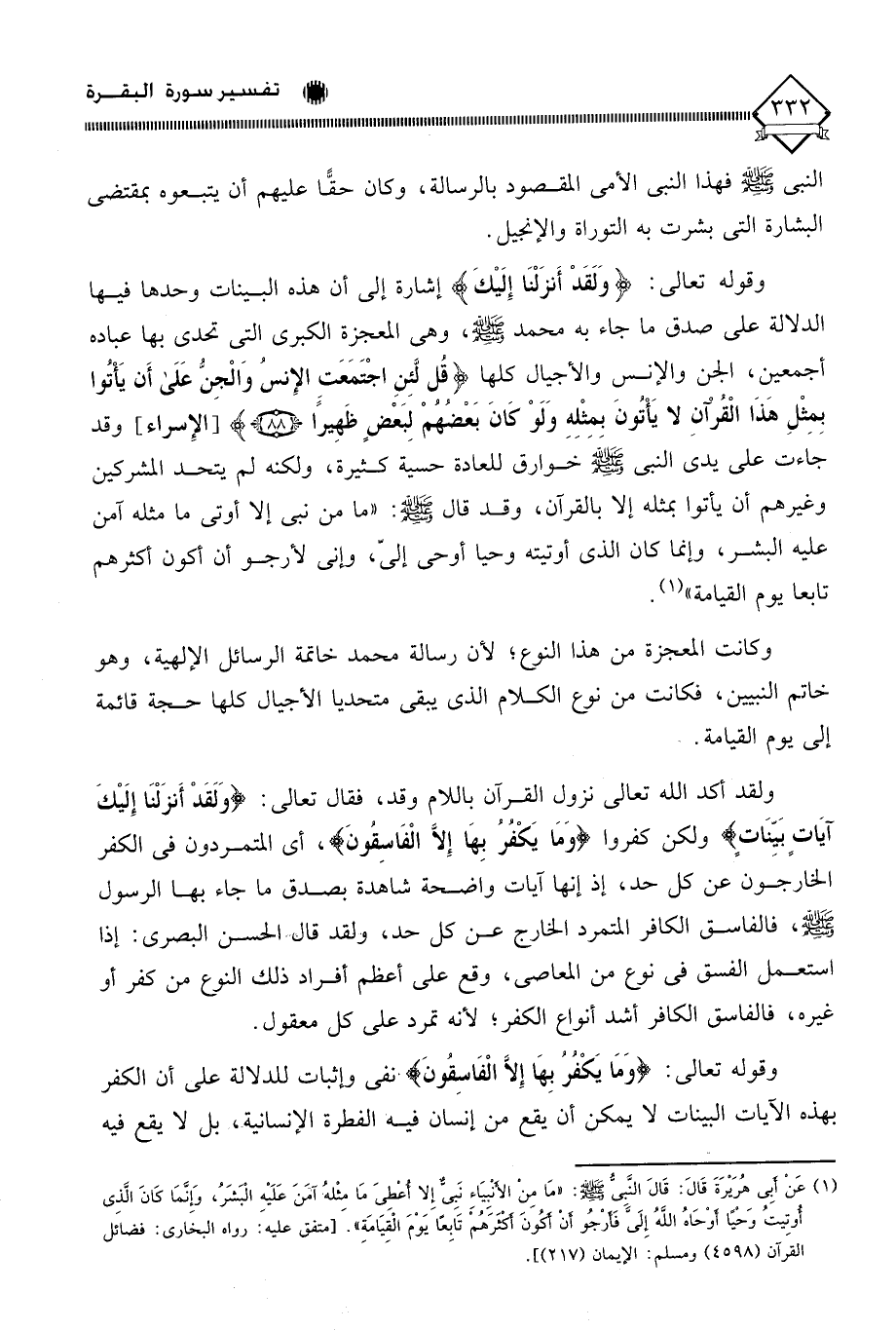 (¬1) عَنْ أبِى هُرَيْرَةَ قَالَ: قَالَ النَّبيُّ - صلى الله عليه وسلم -: " مَا منْ الأنْبيَاءِ نَبِي إِلا أعْطِي مَا مِثلهُ آمَنَ عَلَيْهِ الْبَشرُ، وَإِنَّمَا كَانَ الَّذي أوتيتُ وَحْيًا أوْحَاهُ اللَّهُ إِلَيًّ فَأرْجُو أنْ اكُوَنَ أكْثرهُمْ تَابِعا يَوْمَ الْقيَامَة ". [متفق عليه: رواه البخاري: فضائل القرآن (4598) ومسلم: الإيمان (217)].