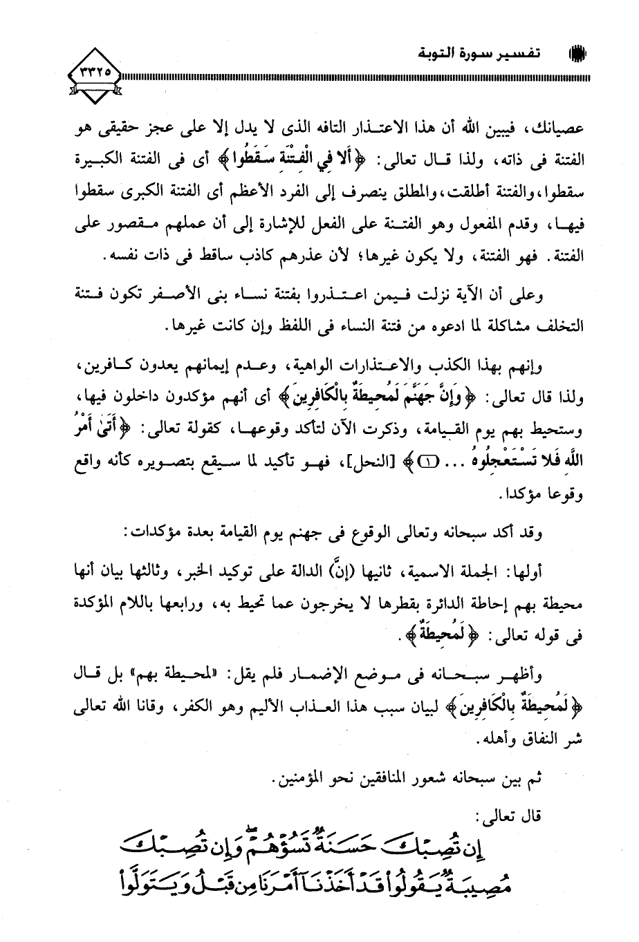 عصيانك، فيبين الله أن هذا الاعتذار التافه الذي لَا يدل إلا على عجز حقيقي هو الفتنة في ذاته، ولذا قال تعالى: (أَلا فِي الْفِتْنَةِ سَقَطُوا) أي في الفتنة الكبيرة سقطوا، والفتنة أطلقت، والمطلق ينصرف إلى الفرد الأعظم أي الفتنة الكبرى سقطوا فيها، وقدم المفعول وهو الفتنة على الفعل للإشارة إلى أن عملهم مقصور على الفتنة. فهو الفتنة، ولا يكون غيرها؛ لأن عذرهم كاذب ساقط في ذات نفسه.