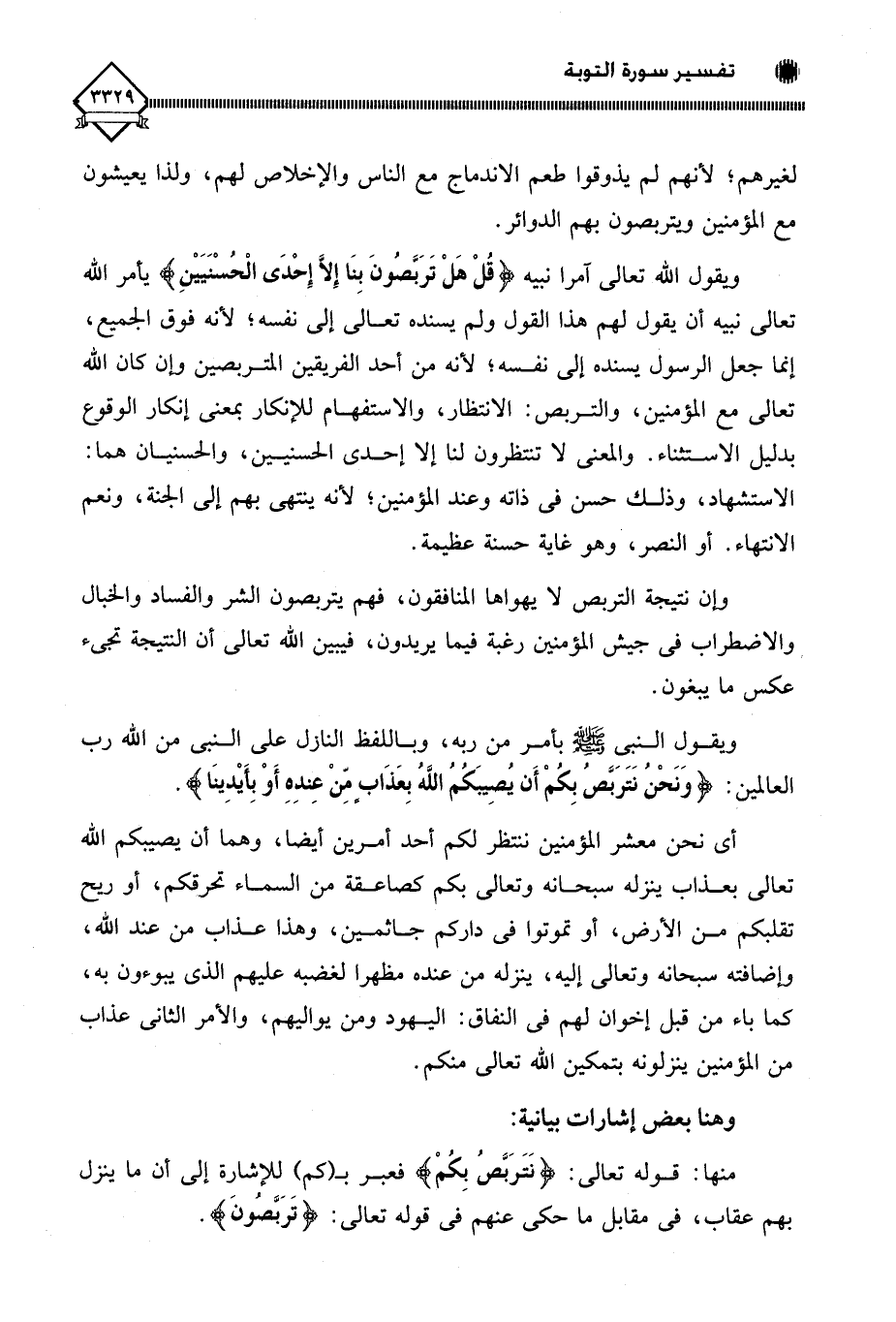 ويقول اللَّه تعالى آمرا نبيه (قُلْ هَلْ تَرَبَّصُونَ بِنَا إِلَّا إِحْدَى الْحُسْنَيَيْنِ) يأمر الله تعالى نبيه أن يقول لهم هذا القول ولم يسنده تعالى إلى نفسه؛ لأنه فوق الجميع، إنما جعل الرسول يسنده إلى نفسه؛ لأنه من أحد الفريقين المتربصين وإن كان الله تعالى مع المؤمنين، والتربص: الانتظار، والاستفهام للإنكار بمعنى إنكار الوقوع بدليل الاستثناء. والمعنى لَا تنتظرون لنا إلا إحدى الحسنيين، والحسنيان هما: الاستشهاد، وذلك حسن في ذاته وعند المؤمنين؛ لأنه ينتهي بهم إلى الجنة، ونعم الانتهاء. أو النصر، وهو غاية حسنة عظيمة.
