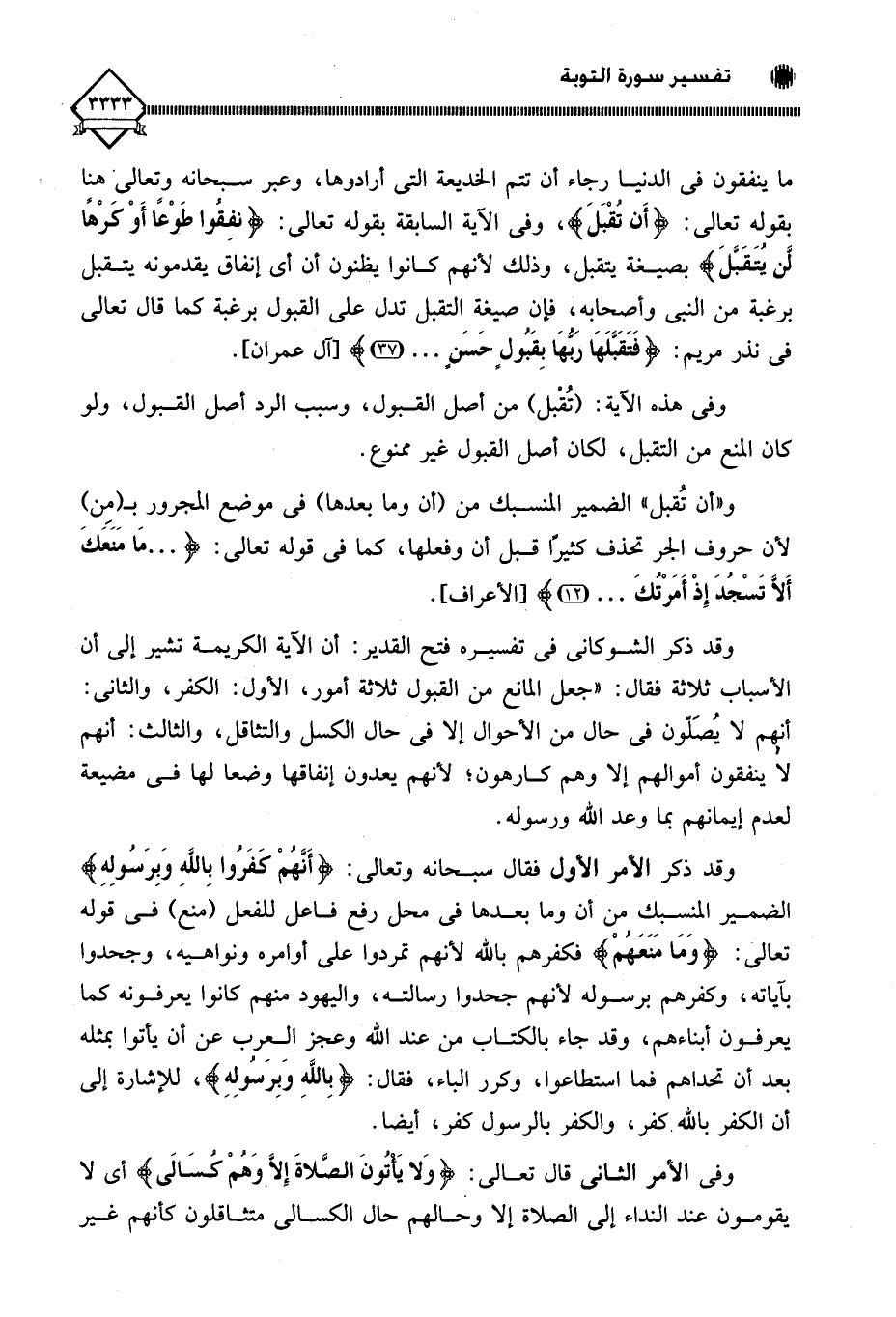وقد ذكر الشوكاني في تفسيره فتح القدير: أن الآية الكريمة تشير إلى أن الأسباب ثلاثة فقال: " جعل المانع من القبول ثلاثة أمور، الأول: الكفر، والثاني: أنهم لَا يُصَلُّون في حال من الأحوال إلا في حال الكسل والتثاقل، والثالث: أنهم لا ينفقون أموالهم إلا وهم كارهون؛ لأنهم يعدون إنفاقها وضعا لها في مضيعة لعدم إيمانهم بما وعد الله ورسوله.