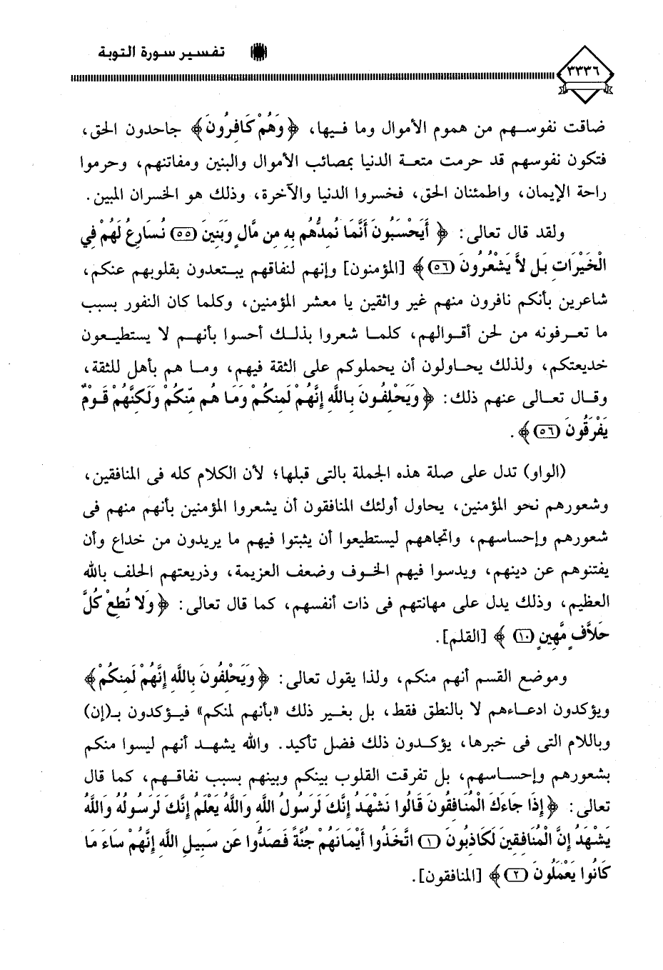 وموضع القسم أنهم منكم، ولذا يقول تعالى: (وَيَحْلِفُونَ بِاللَّهِ إِنَّهُمْ لَمِنكُمْ) ويؤكدون ادعاءهم لَا بالنطق فقط، بل بغير ذلك " بأنهم لمنكم " فيؤكدون بـ (إن) وباللام التي في خبرها، يؤكدون ذلك فضل تأكيد. والله يشهد أنهم ليسوا منكم بشعورهم وإحساسهم، بل تفرقت القلوب بينكم وبينهم بسبب نفاقهم، كما قال تعالى: (إِذَا جَاءَكَ الْمُنَافِقُونَ قَالُوا نَشْهَدُ إِنَّكَ لَرَسُولُ اللَّهِ وَاللَّهُ يَعْلَمُ إِنَّكَ لَرَسُولُهُ وَاللَّهُ يَشْهَدُ إِنَّ الْمُنَافِقِينَ لَكَاذِبُونَ (1) اتَّخَذُوا أَيْمَانَهُمْ جُنَّةً فَصَدُّوا عَنْ سَبِيلِ اللَّهِ إِنَّهُمْ سَاءَ مَا كَانُوا يَعْمَلُونَ (2).