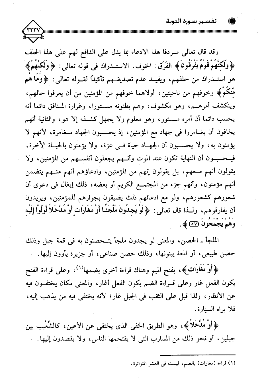 الملجأ - الحصن، والمعنى لو يجدون ملجأ يتحصنون به في قمة جبل وذلك حصن طبيعي، أو قلعة يبنونها، وذلك حص صناعي، أو جزيرة يأوون إليها. (أَوْ مَغَارَاتٍ)، بفتح الميم وهناك قراءة أخرى بضمها (¬1)، وعلى قراءة الفتح يكون الفعل غار وعلى قراءة الضم يكون الفعل أغار، والمعنى مكان يختفون فيه عن الأنظار، ولذا قيل على الثقب في الجبل غار؛ لأنه يختفى فيه من يذهب إليه، فلا يراه السيارة.