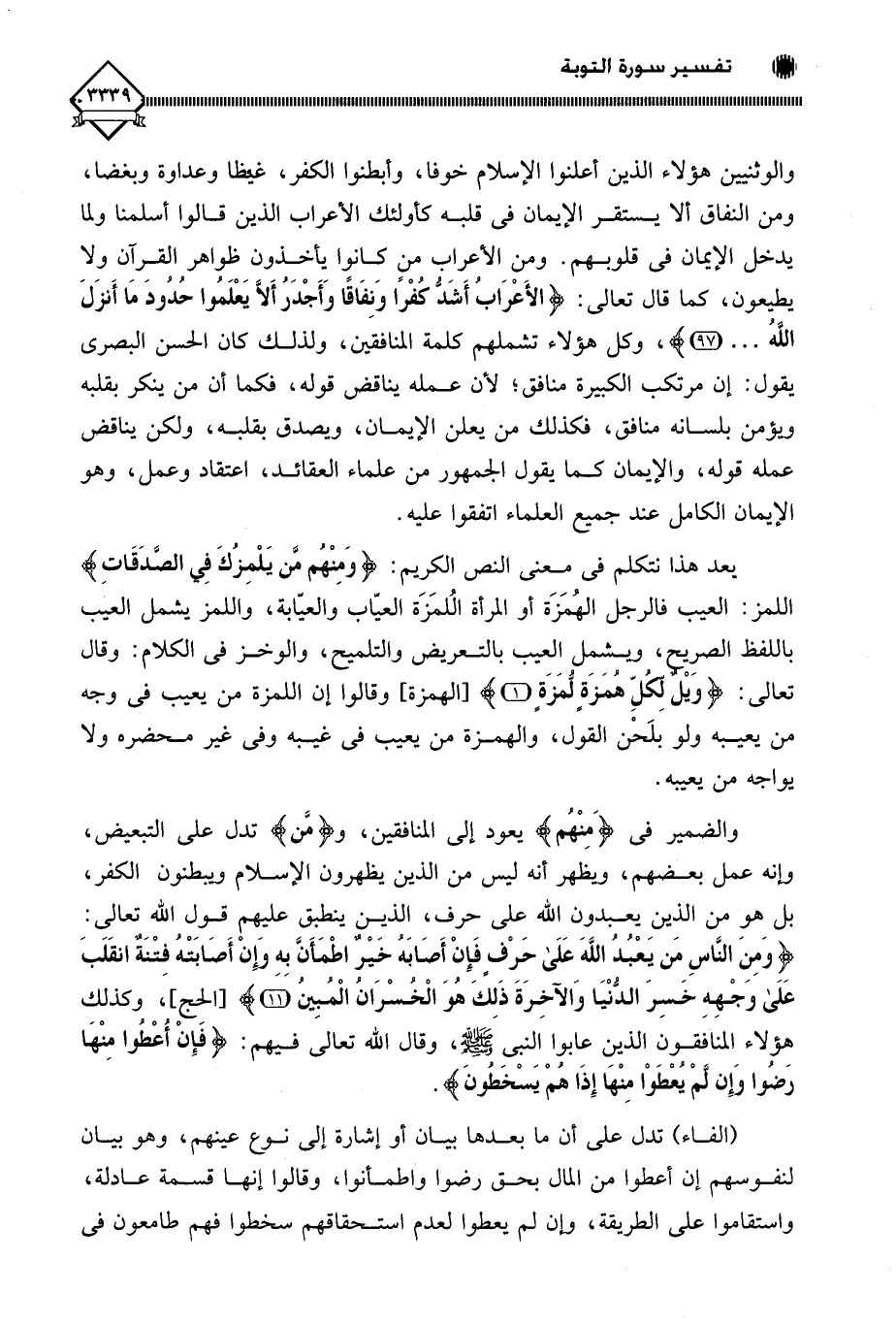 والضمير في (مِنْهُم) يعود إلى المنافقين، و (مِن) تدل على التبعيض، وإنه عمل بعضهم، ويظهر أنه ليس من الذين يظهرون الإسلام ويبطنون الكفر، بل هو من الذين يعبدون الله على حرف، الذين ينطبق عليهم قول الله تعالى: (وَمِنَ النَّاسِ مَنْ يَعْبُدُ اللَّهَ عَلَى حَرْفٍ فَإِنْ أَصَابَهُ خَيْرٌ اطْمَأَنَّ بِهِ وَإِنْ أَصَابَتْهُ فِتْنَةٌ انْقَلَبَ عَلَى وَجْهِهِ خَسِرَ الدُّنْيَا وَالْآخِرَةَ ذَلِكَ هُوَ الْخُسْرَانُ الْمُبِينُ (11). وكذلك هؤلاء المنافقون الذين عابوا النبي - صلى الله عليه وسلم -، وقال الله تعالى فيهم: (فإِنْ أُعْطُوا منْهَا رَضُوا وَإِن لَمْ يُعْطَوْا مِنْهَا إِذَا هُمْ يَسْخَطُونَ).