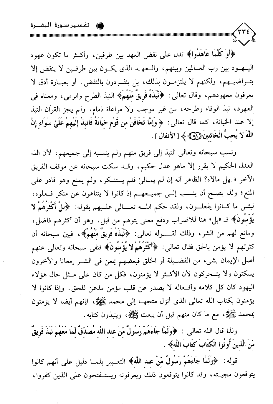 (أَوَكُلَّمَا عَاهَدُوا ... (100) تدل على نقض العهد بين طرفين، وأكثر ما تكون عهود اليهود بين رب العالمين وبينهم، والعهد الذي يكون بين طرفين لَا ينقض إلا بتراضيهم، ولكنهم لَا يلتزمون بذلك، بل ينفردون بالنقض. أو بعبارة أدق لا يعرفون معهودهم، وقال تعالى: (نَّبَذَهُ فَرِيقٌ مِنْهمْ) النبذ الطرح والرمي، ومعناه في العهود، نبذ الوفاء وطرحه، من غير موجب ولا مراعاة ذمامٍ، ولم يجز القرآن النبذ إلا عند الخيانة، كما قال تعالى: (وَإمَّا تَخَافَنَّ مِن قَوْمٍ خِيَانَة فَانبِذْ إِلَيْهِمْ عَلَى سَوَاءٍ إِنَّ اللَّهَ لَا يُحِبُّ الْخَائِنِينَ).