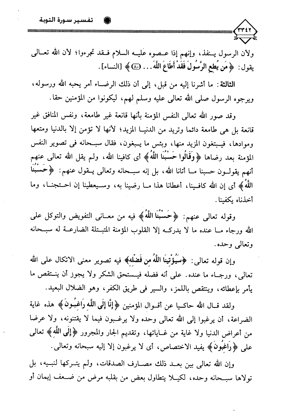 وقد صور الله تعالى النفس المؤمنة بأنها قانعة غير طامعة، ونفس المنافق غير قانعة بل هي طامعة دائما وتريد من الدنيا المزيد؛ لأنها لَا تؤمن إلا بالدنيا ومتعها وموادها، فيبتغون المزيد منها، وبئس ما يبغون، فقال سبحانه في تصوير النفس المؤمنة بعد رضاها (وَقَالُوا حَسْبُنَا اللَّهُ) أي كافينا الله، ولم يقل الله تعالى عنهم أنهم يقولون حسبنا ما أتانا الله، بل إنه سبحانه وتعالى يقول عنهم: (حَسْبُنَا اللَّه) أي إن الله كافينا، أعطانا هذا ما رضينا به، وسيعطينا إن احتجنا، وما أخذناه يكفينا.