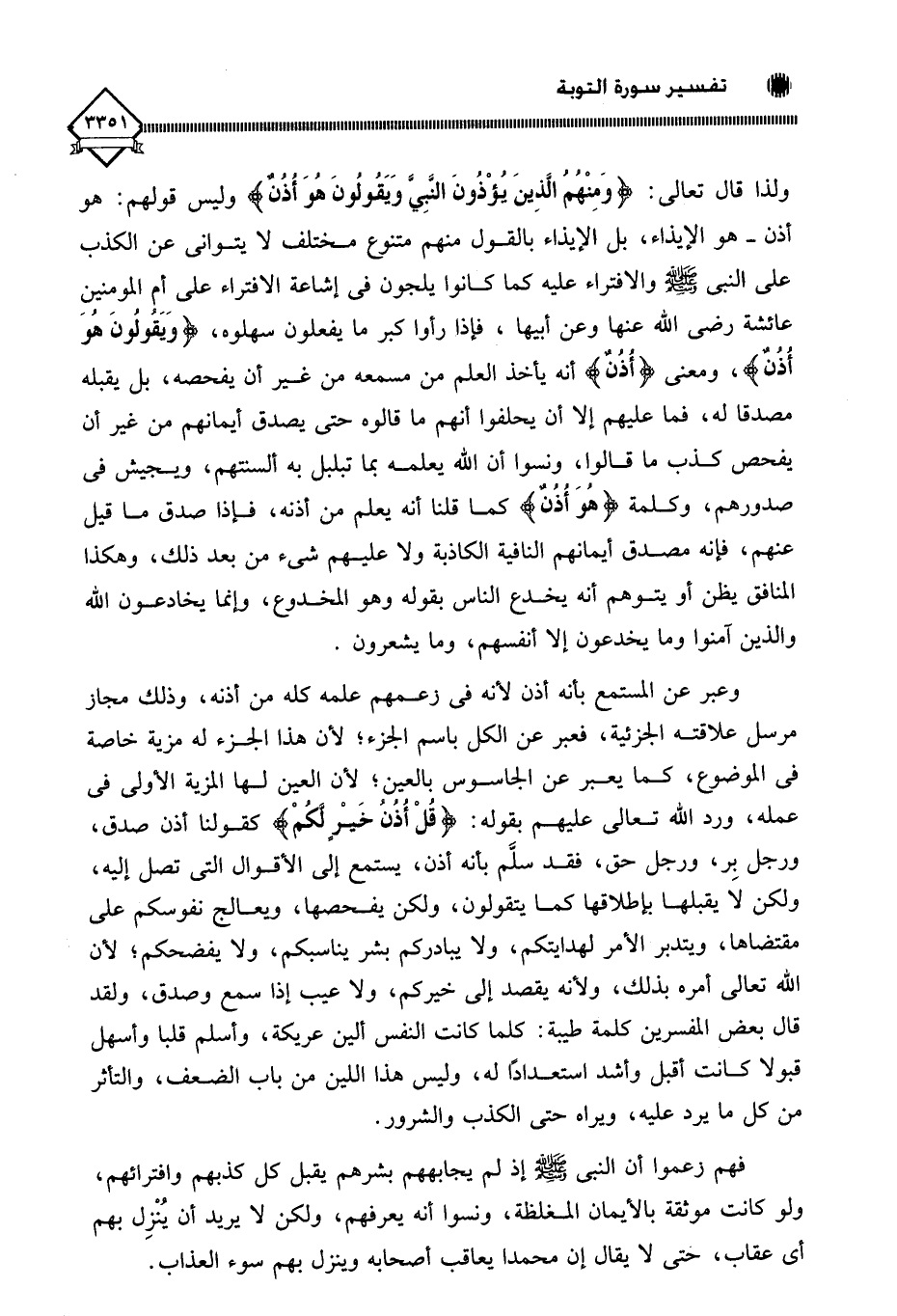 وعبر عن المستمع بأنه أذن لأنه في زعمهم علمه كله من أذنه، وذلك مجاز مرسل علاقته الجزئية، فعبر عن الكل باسم الجزء؛ لأن هذا الجزء له مزية خاصة في الموضوع، كما يعبر عن الجاسوس بالعين؛ لأن العين لها المزية الأولى في عمله، ورد الله تعالى عليهم بقوله: (قُلْ أُذنُ خَيْرٍ لَكُمْ) كقولنا أذن صدق، ورجل بِر، ورجل حق، فقد سلَّم بأنه أذن، يستمع إلى الأقوال التي تصل إليه، ولكن لَا يقبلها بإِطلاقها كما يتقولون، ولكن يفحصها، ويعالج نفوسكم على مقتضاها، ويتدبر الأمر لهدايتكم، ولا يبادركم بشر يناسبكم، ولا يفضحكم؛ لان الله تعالى أمره بذلك، ولأنه يقصد إلى خيركم، ولا عيب إذا سمع وصدق، ولقد قال بعض المفسرين كلمة طيبة: كلما كانت النفس ألين عريكة، وأسلم قلبا وأسهل قبولا كانت أقبل وأشد استعدادًا له، وليس هذا اللين من باب الضعف، والتأثر من كل ما يرد عليه، ويراه حتى الكذب والشرور.
