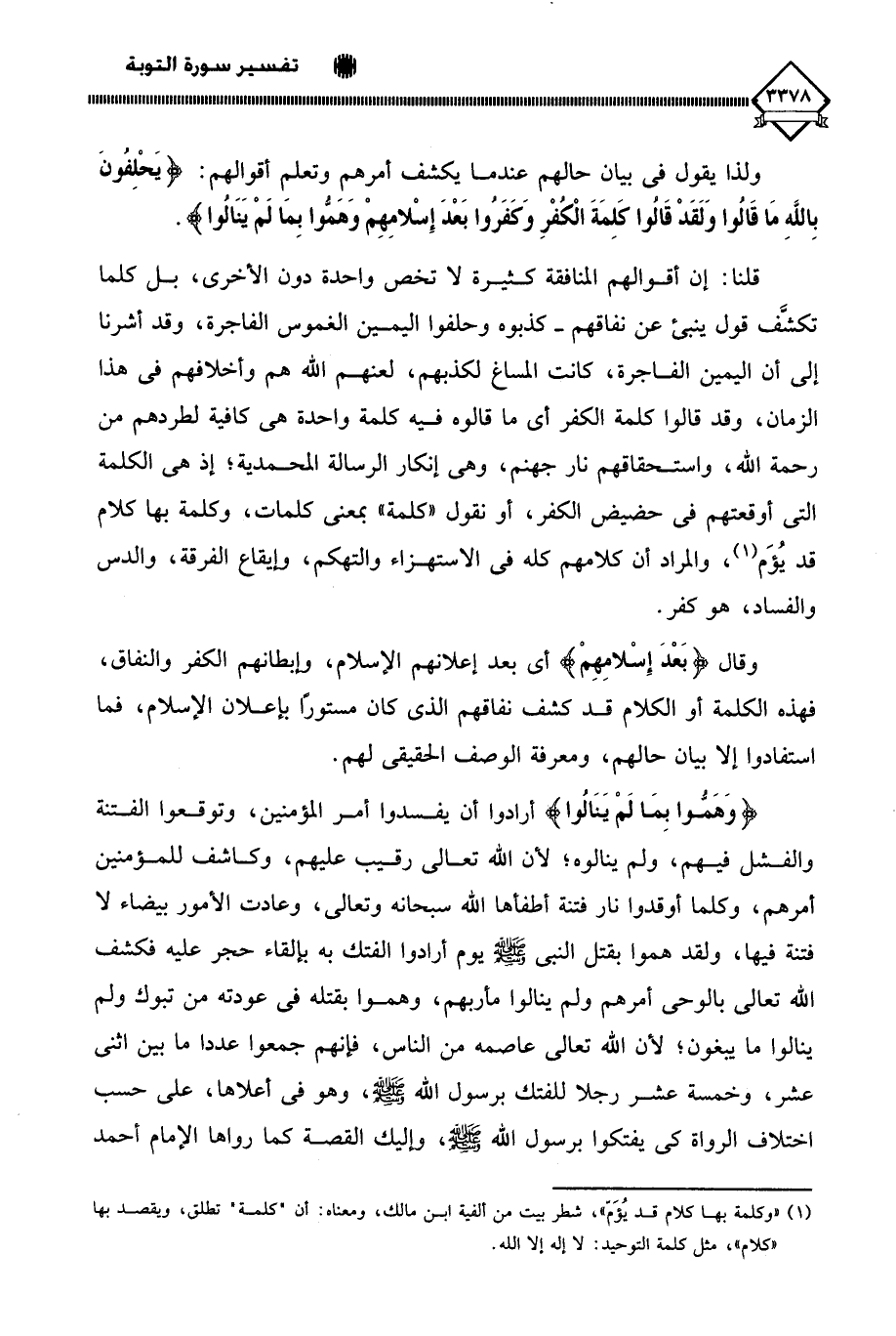 قلنا: إن أقوالهم المنافقة كثيرة لَا تخص واحدة دون الأخرى، بل كلما تكشتَف قول ينبئ عن نفاقهم - كذبوه وحلفوا اليمين الغموس الفاجرة، وقد أشرنا إلى أن اليمين الفاجرة، كانت المساغ لكذبهم، لعنهم الله هم وأخلافهم في هذا الزمان، وقد قالوا كلمة الكفر أي ما قالوه فيه كلمة واحدة هي كافية لطردهم من رحمة الله، واستحقاقهم نار جهنم، وهي إنكار الرسالة المحمدية؛ إذ هي الكلمة التي أوقعتهم في حضيض الكفر، أو نقول " كلمة " بمعنى كلمات، وكلمة بها كلام قد يُؤَم (¬1)، والمراد أن كلامهم كله في الاستهزاء والتهكم، وإيقاع الفرقة، والدس والفساد، هو كفر.
