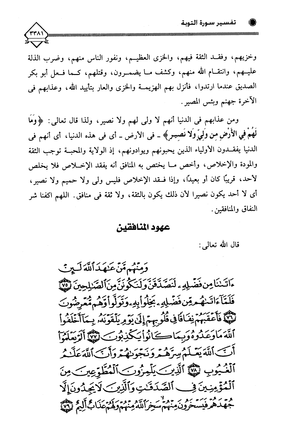 (وَمِنْهُمْ مَنْ عَاهَدَ اللَّهَ لَئِنْ آتَانَا مِنْ فَضْلِهِ لَنَصَّدَّقَنَّ وَلَنَكُونَنَّ مِنَ الصَّالِحِينَ (75) فَلَمَّا آتَاهُمْ مِنْ فَضْلِهِ بَخِلُوا بِهِ وَتَوَلَّوْا وَهُمْ مُعْرِضُونَ (76) فَأَعْقَبَهُمْ نِفَاقًا فِي قُلُوبِهِمْ إِلَى يَوْمِ يَلْقَوْنَهُ بِمَا أَخْلَفُوا اللَّهَ مَا وَعَدُوهُ وَبِمَا كَانُوا يَكْذِبُونَ (77) أَلَمْ يَعْلَمُوا أَنَّ اللَّهَ يَعْلَمُ سِرَّهُمْ وَنَجْوَاهُمْ وَأَنَّ اللَّهَ عَلَّامُ الْغُيُوبِ (78) الَّذِينَ يَلْمِزُونَ الْمُطَّوِّعِينَ مِنَ الْمُؤْمِنِينَ فِي الصَّدَقَاتِ وَالَّذِينَ لَا يَجِدُونَ إِلَّا جُهْدَهُمْ فَيَسْخَرُونَ مِنْهُمْ سَخِرَ اللَّهُ مِنْهُمْ وَلَهُمْ عَذَابٌ أَلِيمٌ (79)
