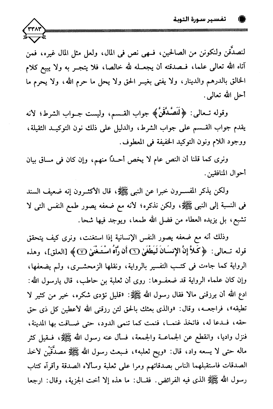 لنصدقن ولنكونن من الصالحين، فهي نص في المال، ولعل مثل المال غيره، فمن آتاه الله تعالى علما، فصدقته أن يجعله لله خالصا، فلا يتجر به ولا يبيع كلام الخالق بالدرهم والدينار، ولا يفتي بغير الحق ولا يحل ما حرم الله، ولا يحرم ما أحل الله تعالى.