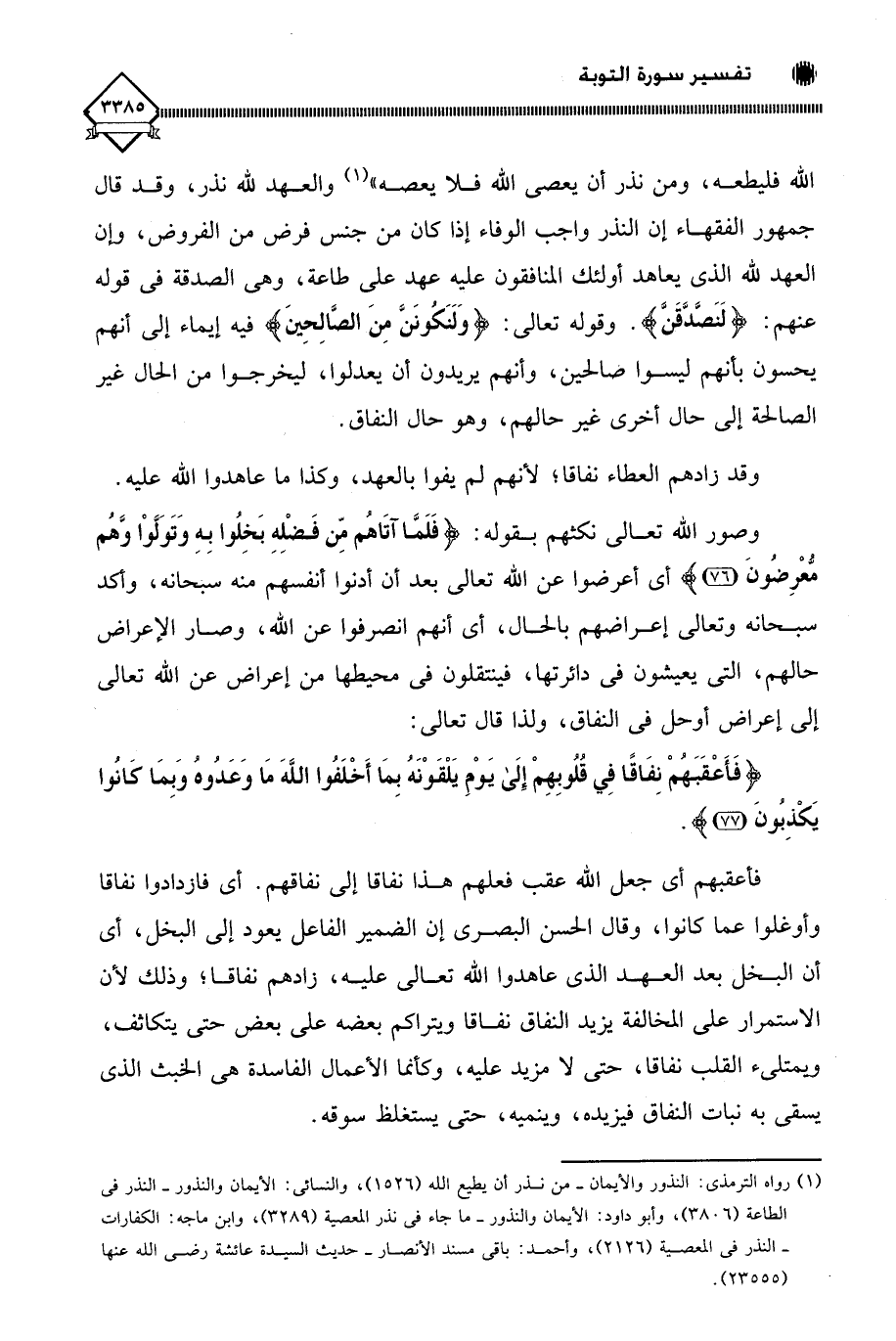فأعقبهم أي جعل الله عقب فعلهم هذا نفاقا إلى نفاقهم. أي فازدادوا نفاقا وأوغلوا عما كانوا، وقال الحسن البصري إن الضمير الفاعل يعود إلى البخل، أي أن البخل بعد العهد الذي عاهدوا الله تعالى عليه، زادهم نفاقا؛ وذلك لأن الاستمرار على المخالفة يزيد النفاق نفاقا ويتراكم بعضه على بعض حتى يتكاثف، ويمتلئ القلب نفاقا، حتى لَا مزيد عليه، وكأنما الأعمال الفاسدة هي الخبث الذي يسقى به نبات النفاق فيزيده، وينميه، حتى يستغلظ سوقه.