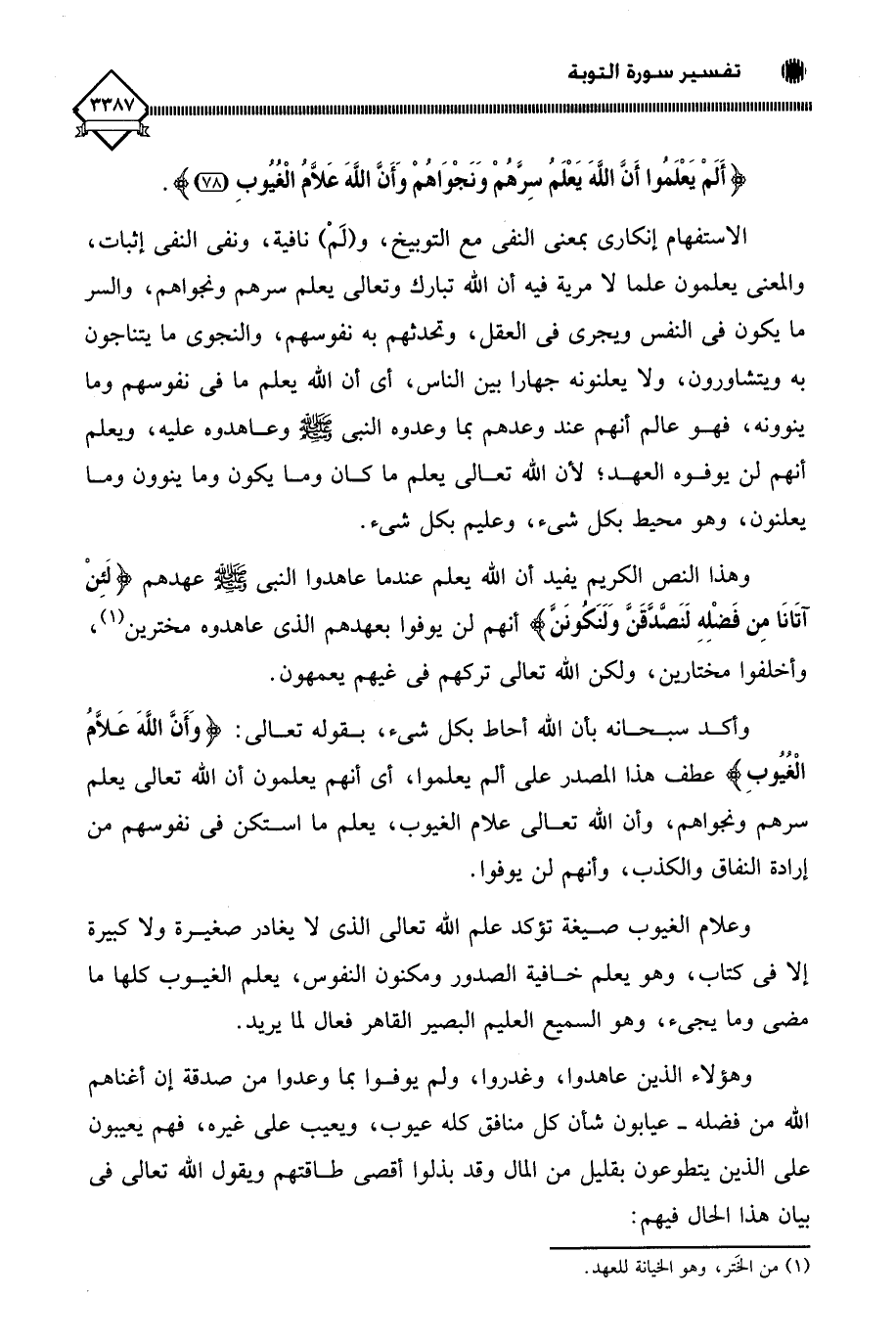 وأكد سبحانه بأن الله أحاط بكل شيء، بقوله تعالى: (وَأَنَّ اللَّهَ عَلَّام الْغُيوبِ) عطف هذا المصدر على ألم يعلموا، أي أنهم يعلمون أن الله تعالى يعلم سرهم ونجواهم، وأن الله تعالى علام الغيوب، يعلم ما استكن في نفوسهم من إرادة النفاق والكذب، وأنهم لن يوفوا.