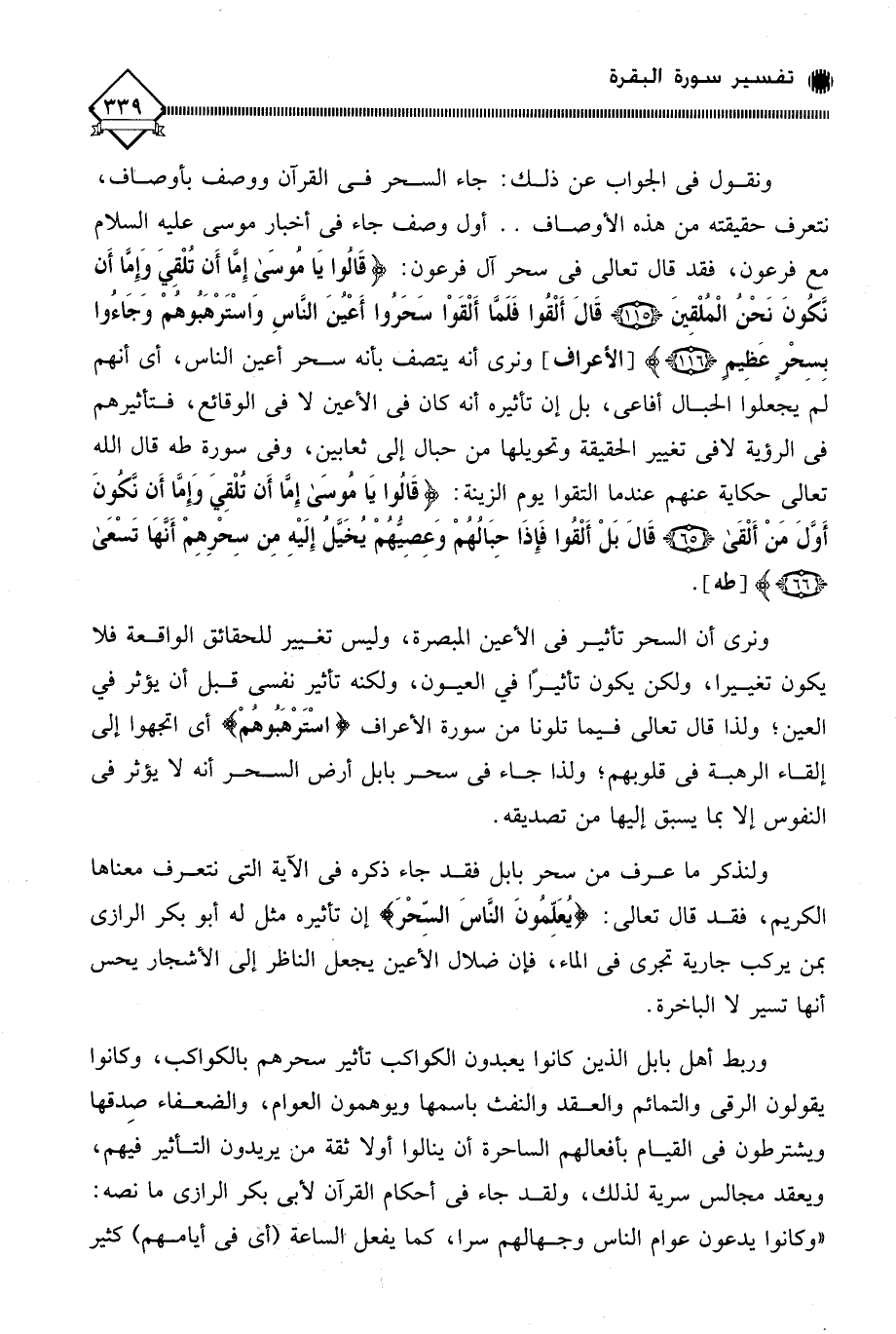 ولنذكر ما عرف من سحر بابل فقد جاء ذكره في الآية التي نتعرف معناها الكريم، فقد قال تعالى: (يُعَلِّمُونَ النَّاسَ السِّحْرَ) إن تأثيره مثل له أبو بكر الرازي بمن يركب جارية تجري في الماء، فإن ضلال الأعين يجعل الناظر إلى الأشجار يحس أنها تسير لَا الباخرة.