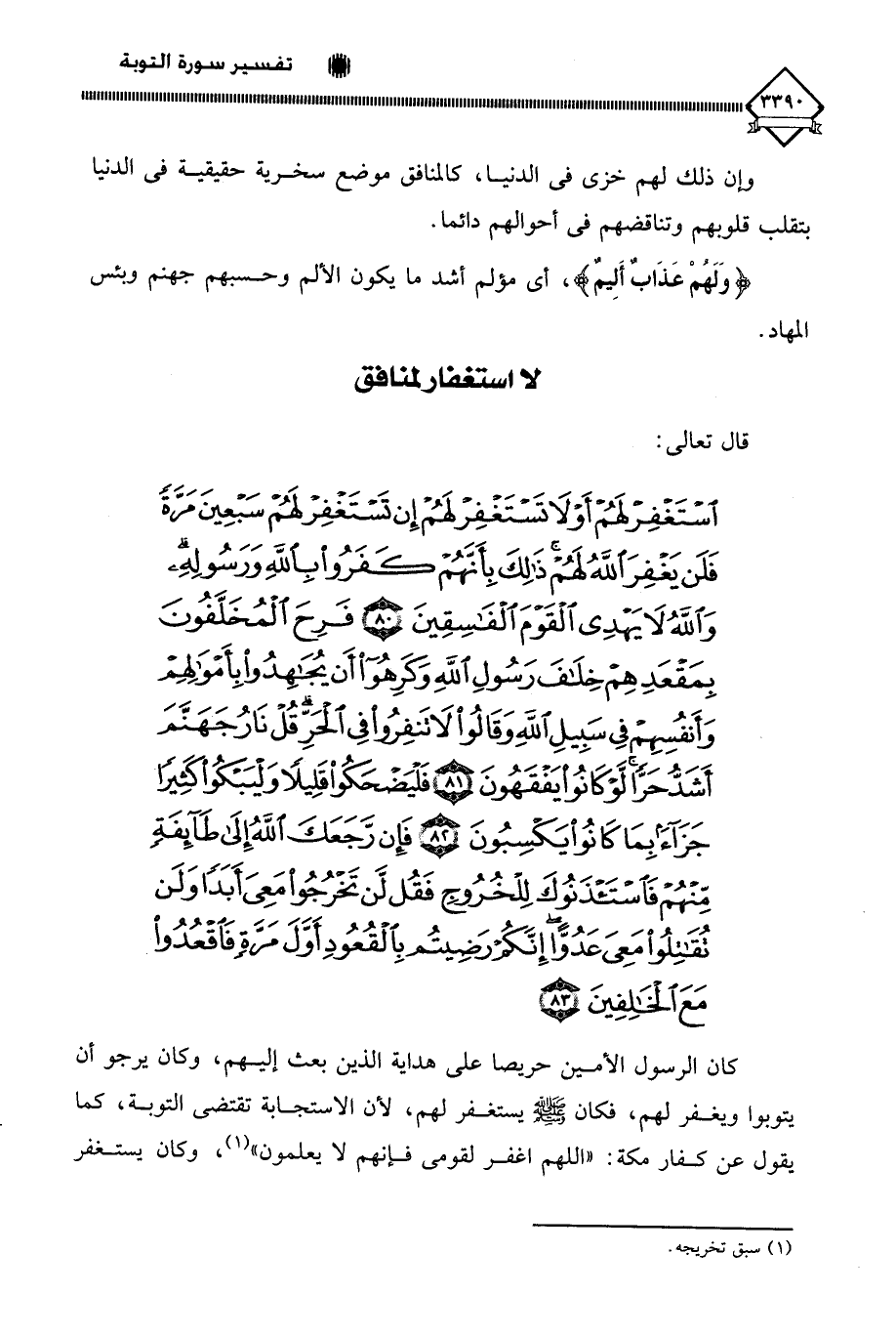 (اسْتَغْفِرْ لَهُمْ أَوْ لَا تَسْتَغْفِرْ لَهُمْ إِنْ تَسْتَغْفِرْ لَهُمْ سَبْعِينَ مَرَّةً فَلَنْ يَغْفِرَ اللَّهُ لَهُمْ ذَلِكَ بِأَنَّهُمْ كَفَرُوا بِاللَّهِ وَرَسُولِهِ وَاللَّهُ لَا يَهْدِي الْقَوْمَ الْفَاسِقِينَ (80) فَرِحَ الْمُخَلَّفُونَ بِمَقْعَدِهِمْ خِلَافَ رَسُولِ اللَّهِ وَكَرِهُوا أَنْ يُجَاهِدُوا بِأَمْوَالِهِمْ وَأَنْفُسِهِمْ فِي سَبِيلِ اللَّهِ وَقَالُوا لَا تَنْفِرُوا فِي الْحَرِّ قُلْ نَارُ جَهَنَّمَ أَشَدُّ حَرًّا لَوْ كَانُوا يَفْقَهُونَ (81) فَلْيَضْحَكُوا قَلِيلًا وَلْيَبْكُوا كَثِيرًا جَزَاءً بِمَا كَانُوا يَكْسِبُونَ (82) فَإِنْ رَجَعَكَ اللَّهُ إِلَى طَائِفَةٍ مِنْهُمْ فَاسْتَأْذَنُوكَ لِلْخُرُوجِ فَقُلْ لَنْ تَخْرُجُوا مَعِيَ أَبَدًا وَلَنْ تُقَاتِلُوا مَعِيَ عَدُوًّا إِنَّكُمْ رَضِيتُمْ بِالْقُعُودِ أَوَّلَ مَرَّةٍ فَاقْعُدُوا مَعَ الْخَالِفِينَ (83)