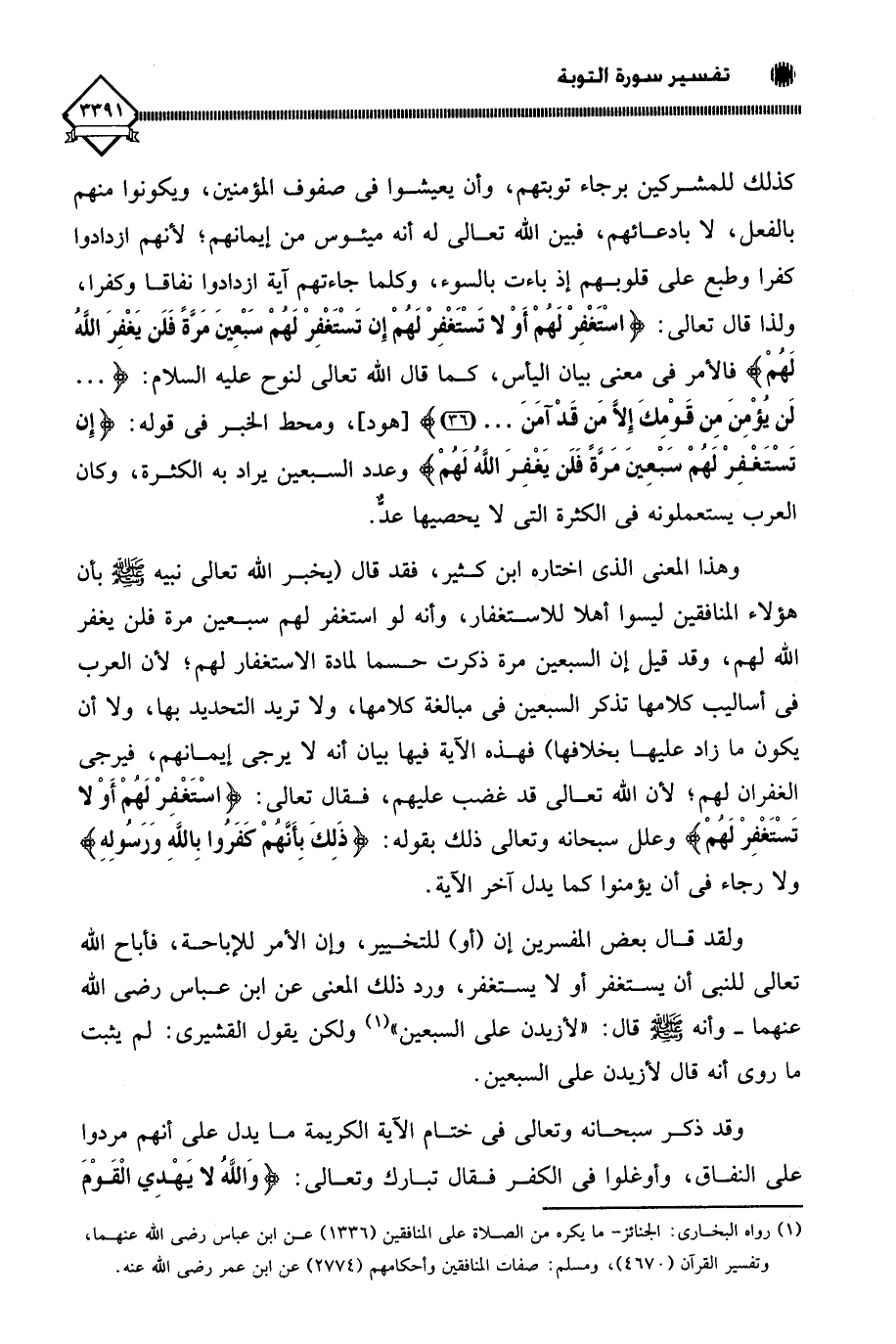 وهذا المعنى الذي اختاره ابن كثير، فقد قال (يخبر الله تعالى نبيه) بأن هؤلاء المنافقين ليسوا أهلا للاستغفار، وأنه لو استغفر لهم سبعين مرة فلن يغفر الله لهم، وقد قيل إن السبعين مرة ذكرت حسما لمادة الاستغفار لهم؛ لأن العرب في أساليب كلامها تذكر السبعين في مبالغة كلامها، ولا تريد التحديد بها، ولا أن يكون ما زاد عليها بخلافها) فهذه الآية فيها بيان أنه لَا يرجى إيمانهم، فيرجى الغفران لهم؛ لأن الله تعالى قد غضب عليهم، فقال تعالى: (اسْتغْفِرْ لَهُمْ أَوْ لا تَسْتَغْفِرْ لَهُمْ) وعلل سبحانه وتعالى ذلك بقوله: (ذَلِكَ بِأَنَّهُمْ كفَرُوا بِاللَّهِ وَرَسُولِهِ) ولا رجاء في أن يؤمنوا كما يدل آخر الآية.