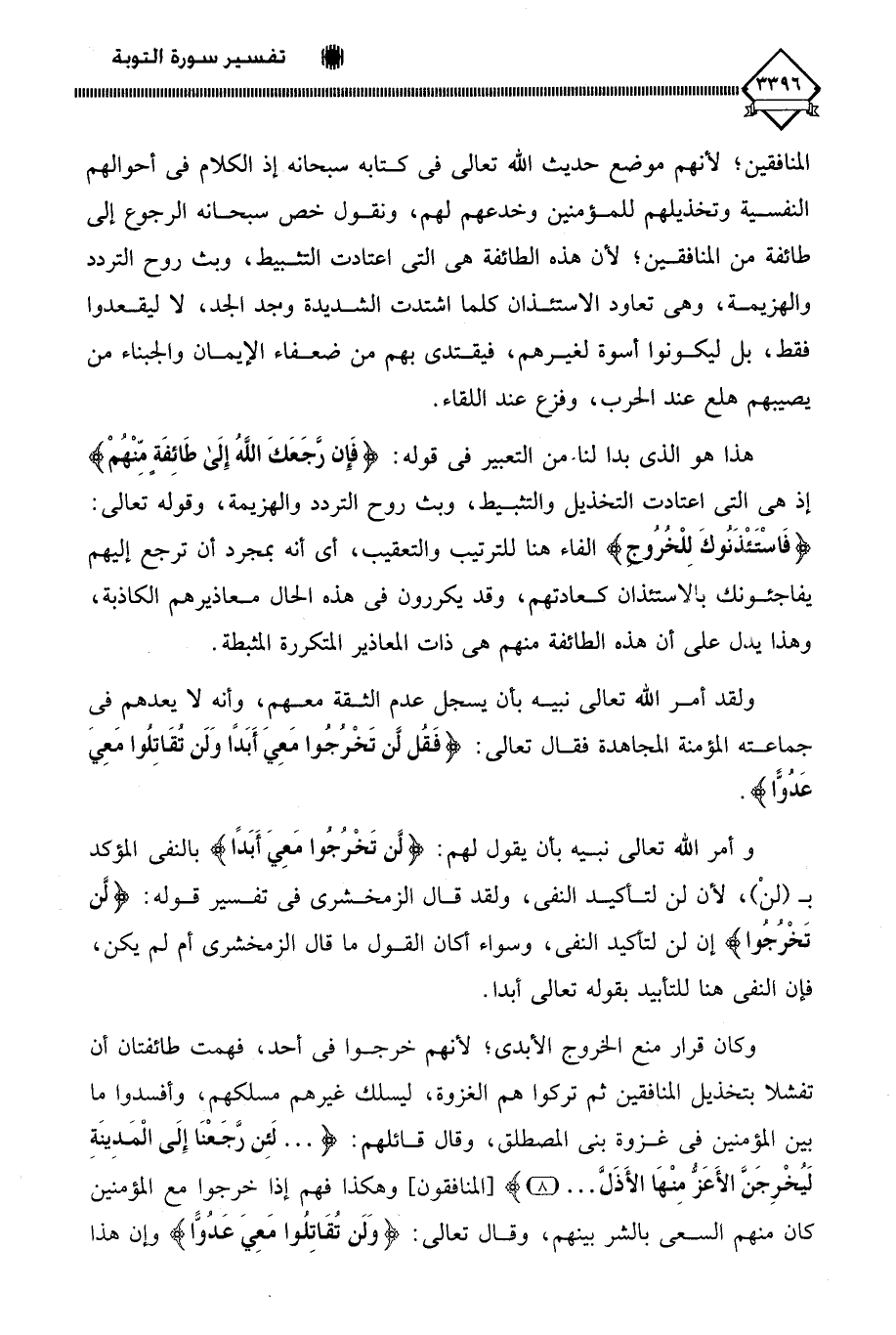 هذا هو الذي بدا لنا. من التعبير في قوله: (فَإِن رَّجَعَكَ اللَّه إِلَى طَائِفَة مِّنْهُمْ) إذ هي التي اعتادت التخذيل والتثبيط، وبث روح التردد والهزيمة، وقوله تعالى: (فَاسْتَأْذَنُوكَ لِلْخُرُوجِ) الفاء هنا للترتيب والتعقيب، أي أنه بمجرد أن ترجع إليهم يفاجئونك بالاستئذان كعادتهم، وقد يكررون في هذه الحال معاذيرهم الكاذبة، وهذا يدل على أن هذه الطائفة منهم هي ذات المعاذير المتكررة المثبطة.