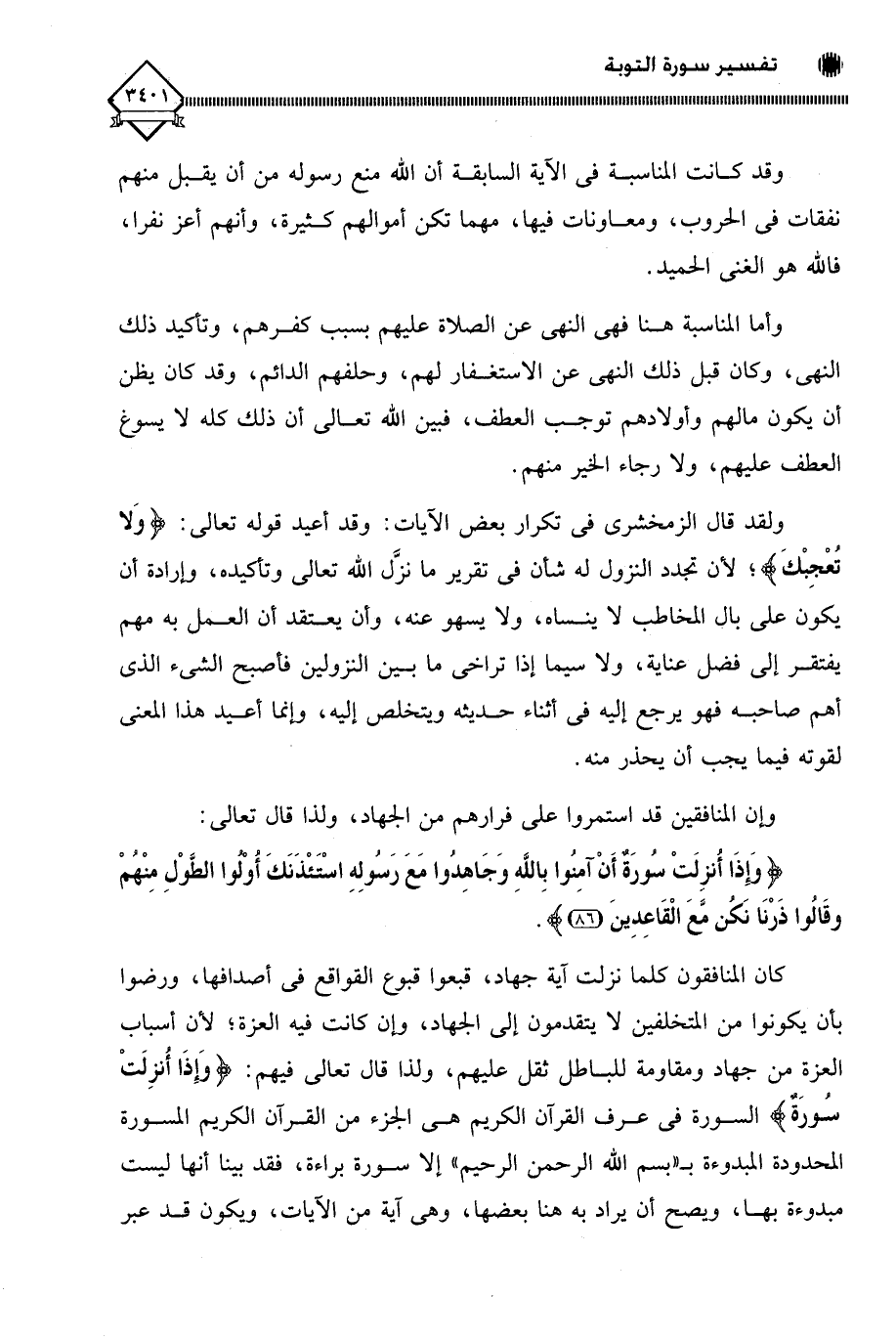 وأما المناسبة هنا فهي النهي عن الصلاة عليهم بسبب كفرهم، وتأكيد ذلك النهي، وكان قبل ذلك النهي عن الاستغفار لهم، وحلفهم الدائم، وقد كان يظن أن يكون مالهم وأولادهم توجب العطف، فبين الله تعالى أن ذلك كله لَا يسوغ العطف عليهم، ولا رجاء الخير منهم.