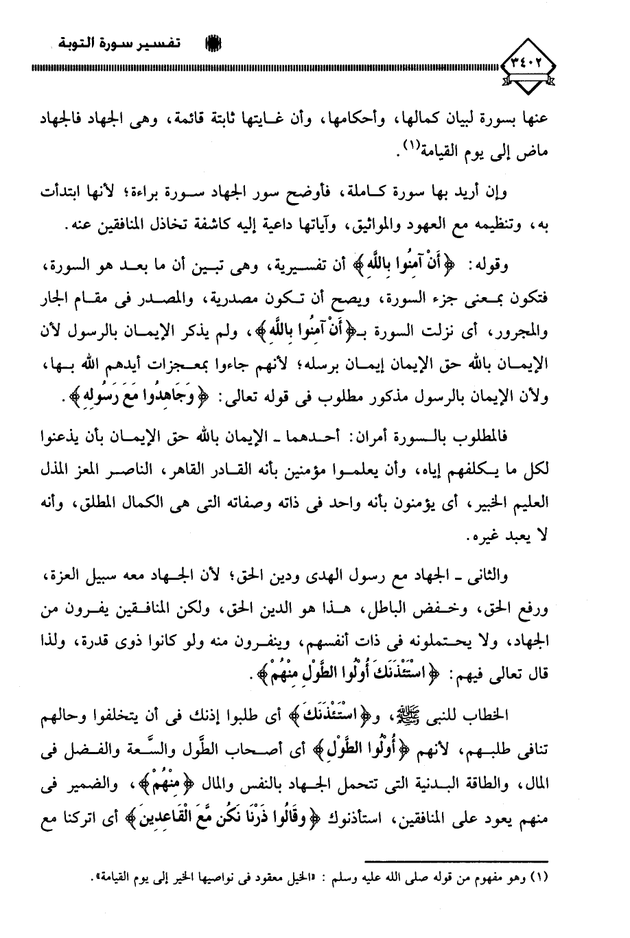 والثاني - الجهاد مع رسول الهدى ودين الحق؛ لأن الجهاد معه سبيل العزة، ورفع الحق، وخفض الباطل، هذا هو الدين الحق، ولكن المنافقين يفرون من الجهاد، ولا يحتملونه في ذات أنفسهم، وينفرون منه ولو كانوا ذوي قدرة، ولذا قال تعالى نيهم: (اسْتَئْذَنَكَ أُولُوا الطوْلِ مِنْهُمْ).