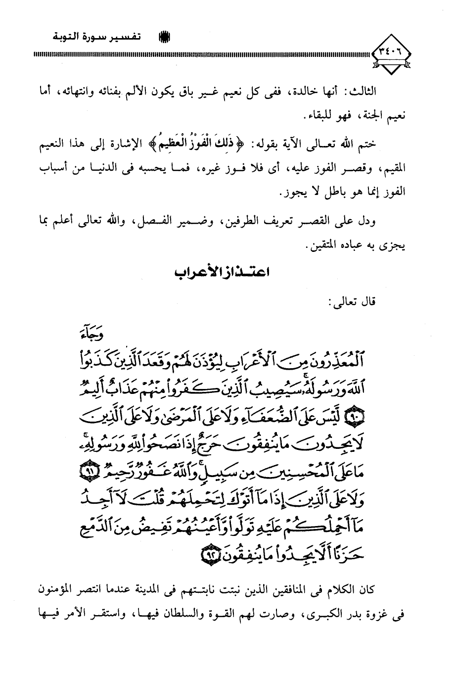 (وَجَاءَ الْمُعَذِّرُونَ مِنَ الْأَعْرَابِ لِيُؤْذَنَ لَهُمْ وَقَعَدَ الَّذِينَ كَذَبُوا اللَّهَ وَرَسُولَهُ سَيُصِيبُ الَّذِينَ كَفَرُوا مِنْهُمْ عَذَابٌ أَلِيمٌ (90) لَيْسَ عَلَى الضُّعَفَاءِ وَلَا عَلَى الْمَرْضَى وَلَا عَلَى الَّذِينَ لَا يَجِدُونَ مَا يُنْفِقُونَ حَرَجٌ إِذَا نَصَحُوا لِلَّهِ وَرَسُولِهِ مَا عَلَى الْمُحْسِنِينَ مِنْ سَبِيلٍ وَاللَّهُ غَفُورٌ رَحِيمٌ (91) وَلَا عَلَى الَّذِينَ إِذَا مَا أَتَوْكَ لِتَحْمِلَهُمْ قُلْتَ لَا أَجِدُ مَا أَحْمِلُكُمْ عَلَيْهِ تَوَلَّوْا وَأَعْيُنُهُمْ تَفِيضُ مِنَ الدَّمْعِ حَزَنًا أَلَّا يَجِدُوا مَا يُنْفِقُونَ (92)
