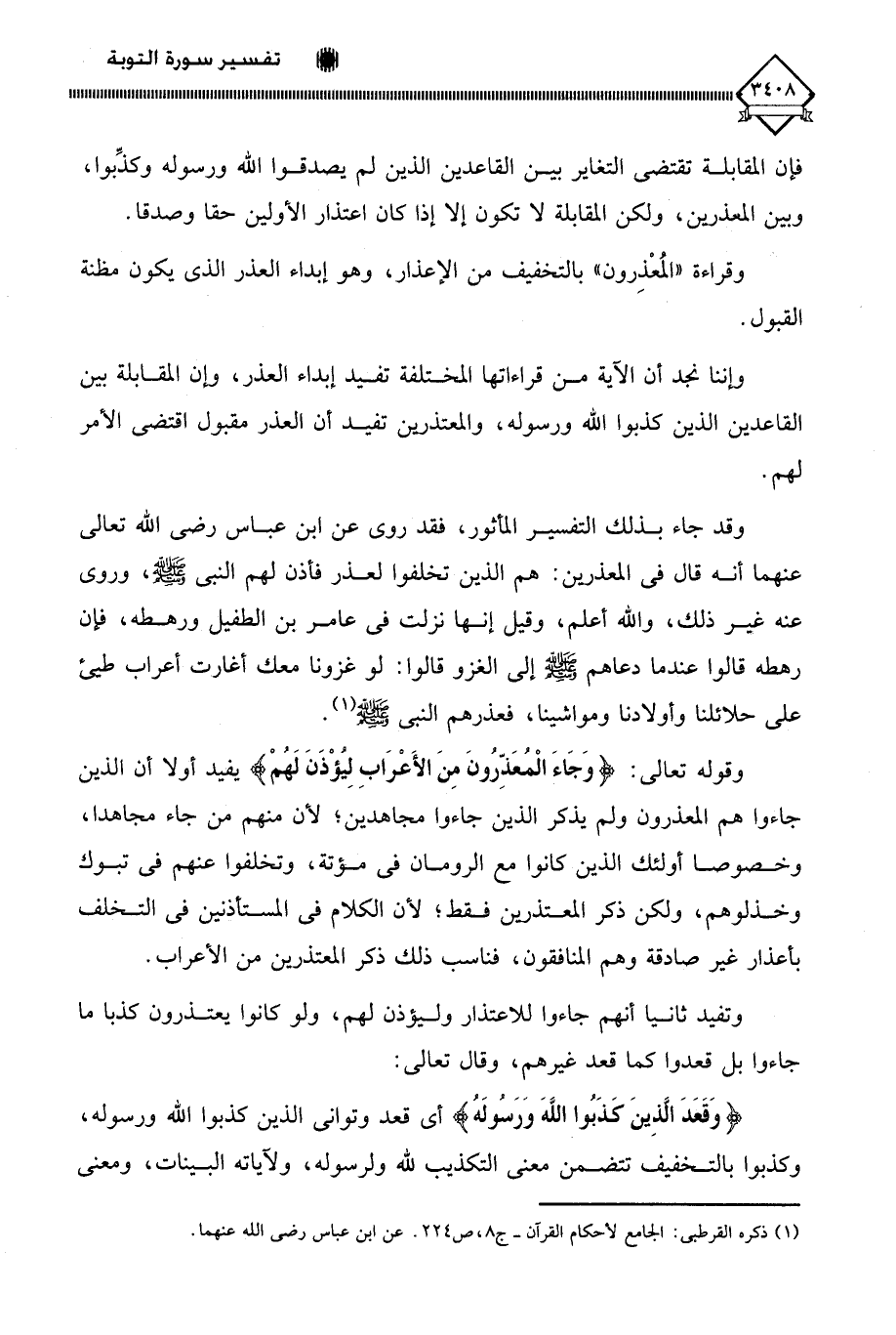 وإننا نجد أن الآية من قراءاتها المختلفة تفيد إبداء العذر، وإن المقابلة بين القاعدين الذين كذبوا الله ورسوله، والمعتذرين تفيد أن العذر مقبول اقتضى الأمر لهم.