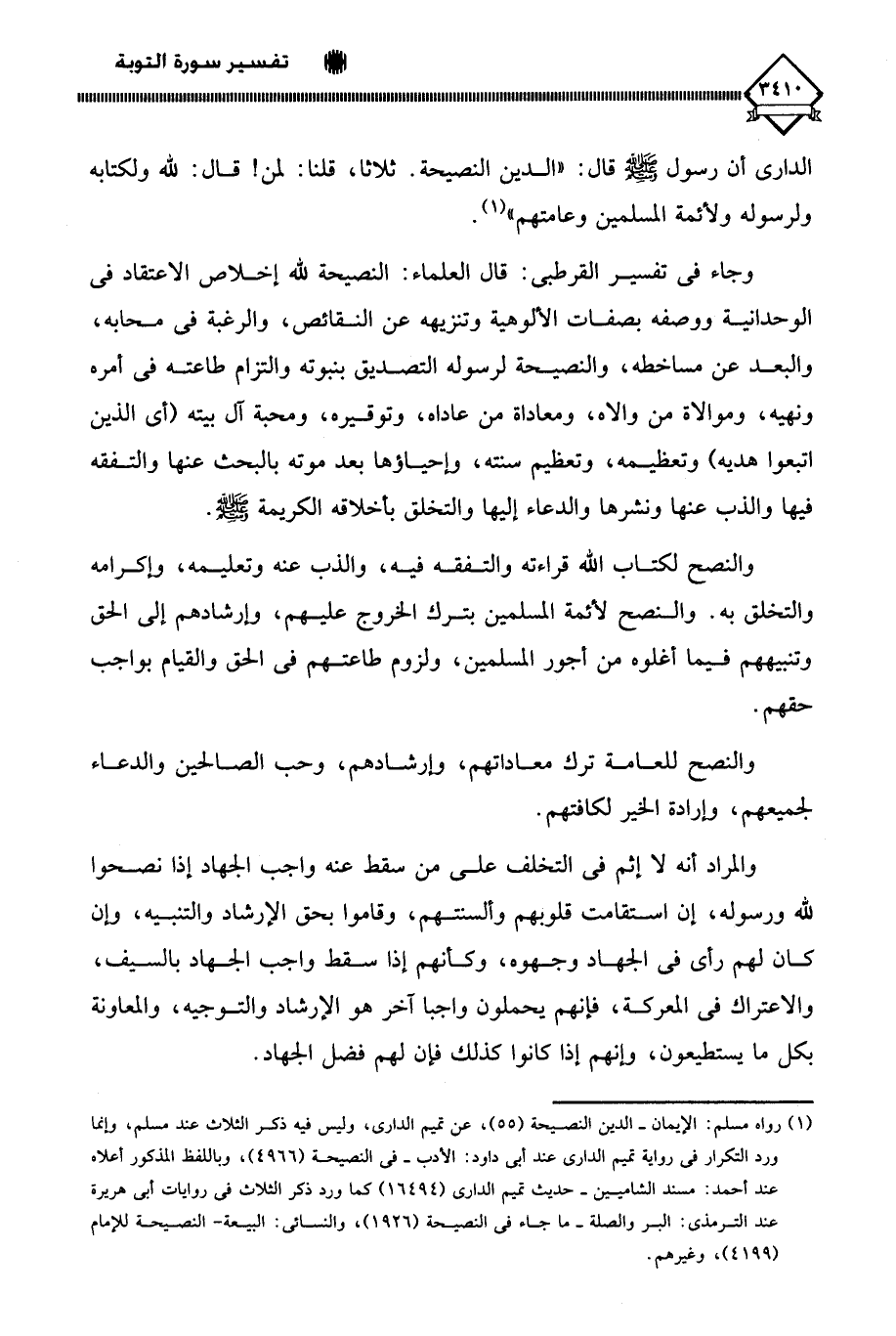 الداري أن رسول الله - صلى الله عليه وسلم - قال: " الدين النصيحة. ثلاثا، قلنا: لمن؟ قال: لِلَّهِ ولكتابه ولرسوله ولأئمة المسلمين وعامتهم " (¬1).