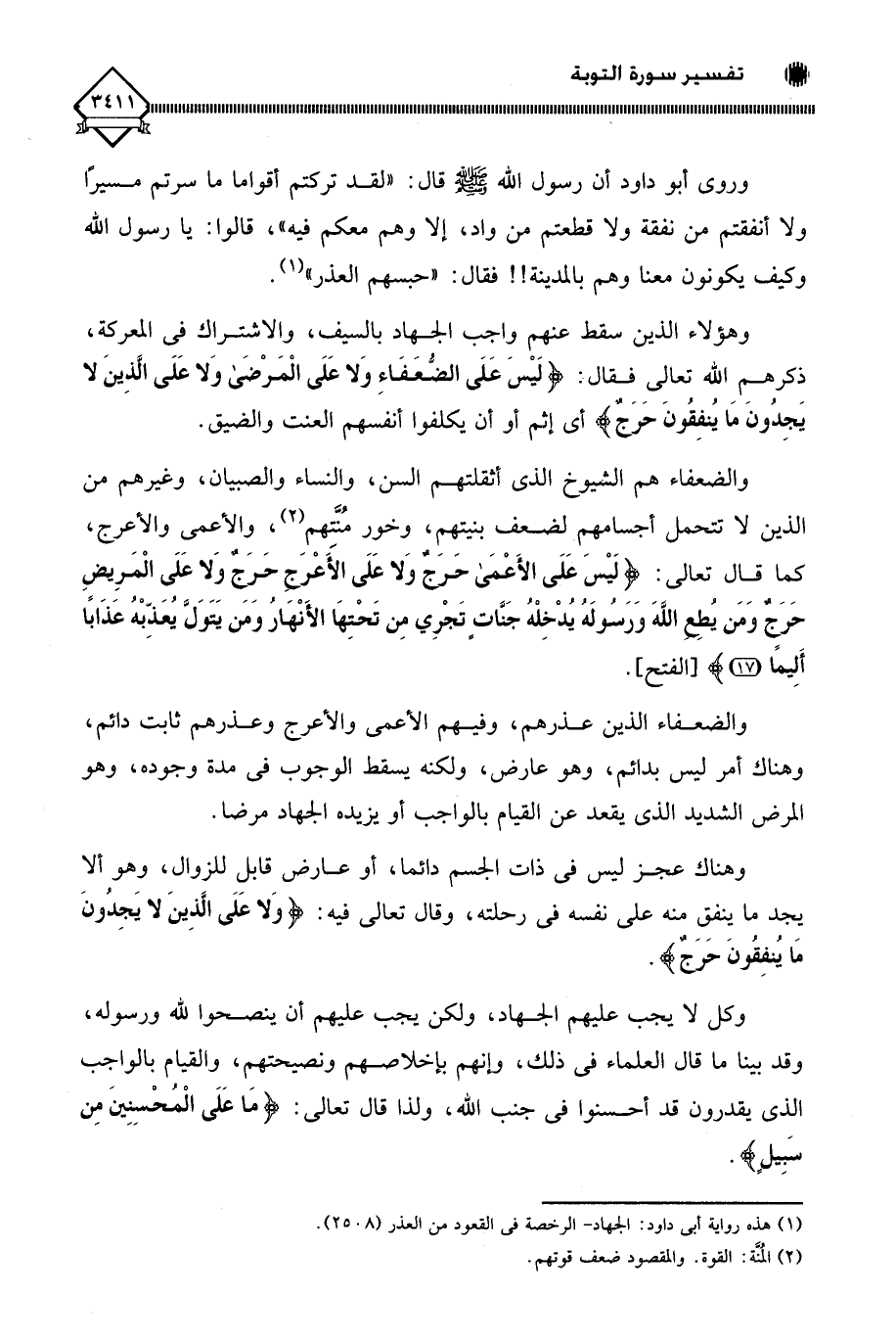 وهؤلاء الذين سقط عنهم واجب الجهاد بالسيف، والاشتراك في المعركة، ذكرهم الله تعالى فقال: (لَيْسَ عَلَى الضُّعَفَاءِ وَلَا عَلَى الْمَرْضَى وَلَا عَلَى الَّذِينَ لَا يَجِدُونَ مَا يُنْفِقُونَ حَرَجٌ) أي إثم أو أن يكلفوا أنفسهم العنت والضيق. والضعفاء هم الشيوخ الذي أثقلتهم السن، والنساء والصبيان، وغيرهم من الذين لَا تتحمل أجسامهم لضعف بنيتهم، وخور مُنَّتِهم (¬2)، والأعمى والأعرج، كما قال تعالى: (لَيْسَ عَلَى الْأَعْمَى حَرَجٌ وَلَا عَلَى الْأَعْرَجِ حَرَجٌ وَلَا عَلَى الْمَرِيضِ حَرَجٌ وَمَنْ يُطِعِ اللَّهَ وَرَسُولَهُ يُدْخِلْهُ جَنَّاتٍ تَجْرِي مِنْ تَحْتِهَا الْأَنْهَارُ وَمَنْ يَتَوَلَّ يُعَذِّبْهُ عَذَابًا أَلِيمًا (17).