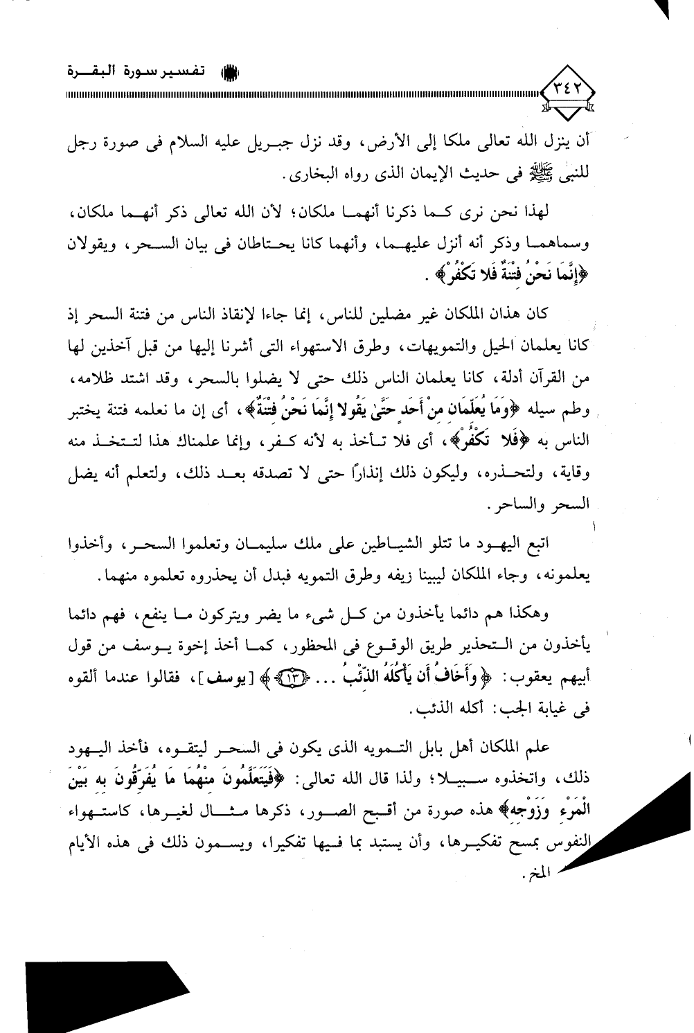 كان هذان الملكان غير مضلين للناس، إنما جاءا لإنقاذ الناس من فتنة السحر إذ كانا يعلمان الحيل والتمويهات، وطرق الاستهواء التي أشرنا إليها من قبل آخذين لها من القرآن أدلة، كانا يعلمان الناس ذلك حتى لَا يضلوا بالسحر، وقد اشتد ظلامه، وطم سيله (وَمَا يُعَلّمَان مِنْ أَحَدٍ حَتَّى يَقُولا إِنَّمَا نَحْنُ فِتْنَةٌ)، أي إن ما نعلمه فتنة يختبر الناس به (فَلَا تَكْفُرْ)، أي فلا تأخذ به لأنه كفر، وإنما علمناك هذا لتتخذ منه وقاية، ولتحذره، وليكون ذلك إنذارًا حتى لَا تصدقه بعد ذلك، ولتعلم أنه يضل السحر والساحر.