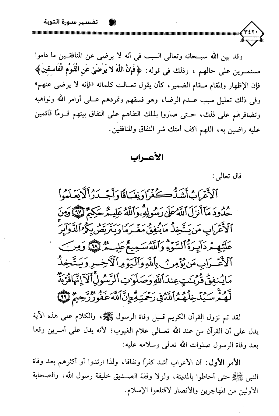 (الْأَعْرَابُ أَشَدُّ كُفْرًا وَنِفَاقًا وَأَجْدَرُ أَلَّا يَعْلَمُوا حُدُودَ مَا أَنْزَلَ اللَّهُ عَلَى رَسُولِهِ وَاللَّهُ عَلِيمٌ حَكِيمٌ (97) وَمِنَ الْأَعْرَابِ مَنْ يَتَّخِذُ مَا يُنْفِقُ مَغْرَمًا وَيَتَرَبَّصُ بِكُمُ الدَّوَائِرَ عَلَيْهِمْ دَائِرَةُ السَّوْءِ وَاللَّهُ سَمِيعٌ عَلِيمٌ (98) وَمِنَ الْأَعْرَابِ مَنْ يُؤْمِنُ بِاللَّهِ وَالْيَوْمِ الْآخِرِ وَيَتَّخِذُ مَا يُنْفِقُ قُرُبَاتٍ عِنْدَ اللَّهِ وَصَلَوَاتِ الرَّسُولِ أَلَا إِنَّهَا قُرْبَةٌ لَهُمْ سَيُدْخِلُهُمُ اللَّهُ فِي رَحْمَتِهِ إِنَّ اللَّهَ غَفُورٌ رَحِيمٌ (99)