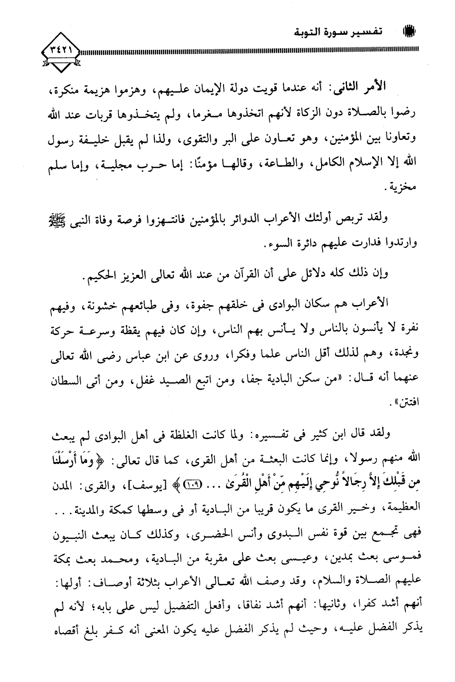 ولقد قال ابن كثير في تفسيره: ولما كانت الغلظة في أهل البوادي لم يبعث الله منهم رسولا، وإنما كانت البعثة من أهل القرى، كما قال تعالى: (وَمَا أَرْسَلْنَا مِن قَبْلِكَ إِلَّا رِجَالًا نُّوحِي إِلَيْهِم مِّنْ أَهْلِ الْقُرَى. . .)، والقرى: المدن العظيمة، وخير القرى ما يكون قريبا من البادية أو في وسطها كمكة والمدينة. . . فهي تجمع بين قوة نفس البدوي وأنس الحضري، وكذلك كان يبعث النبيون فموسى بعث بمدين، وعيسى بعث على مقربة من البادية، ومحمد بعث بمكة عليهم الصلاة والسلام، وقد وصف الله تعالى الأعراب بثلاثة أوصاف: أولها: أنهم أشد كفرا، وثانيها: أنهم أشد نفاقا، وأفعل التفضيل ليس على بابه؛ لأنه لم يذكر الفضل عليه، وحيث لم يذكر الفضل عليه يكون المعنى أنه كفر بلغ أقصاه