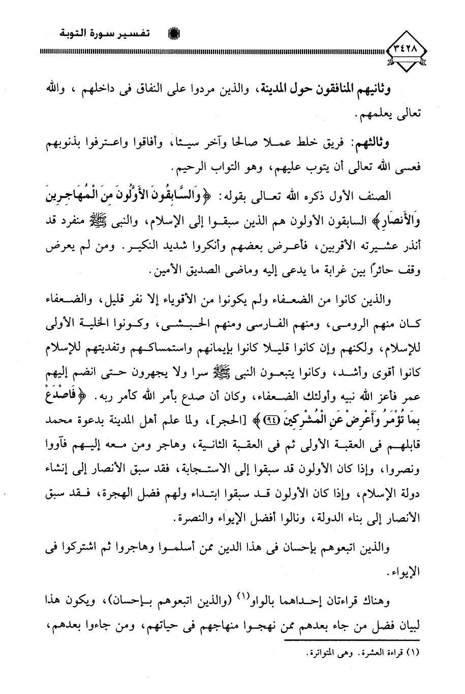 (وَالسَّابِقُونَ الأَوَّلُونَ مِنَ الْمُهَاجِرِينَ وَالأَنصَارِ) السابقون الأولون هم الذين سبقوا إلى الإسلام، والنبي - صلى الله عليه وسلم - منفرد قد أنذر عشيرته الأقربين، فأعرض بعضهم وأنكروا شديد النكير. ومن لم يعرض وقف حائرًا بين غرابة ما يدعى إليه وماضي الصديق الأمين.
