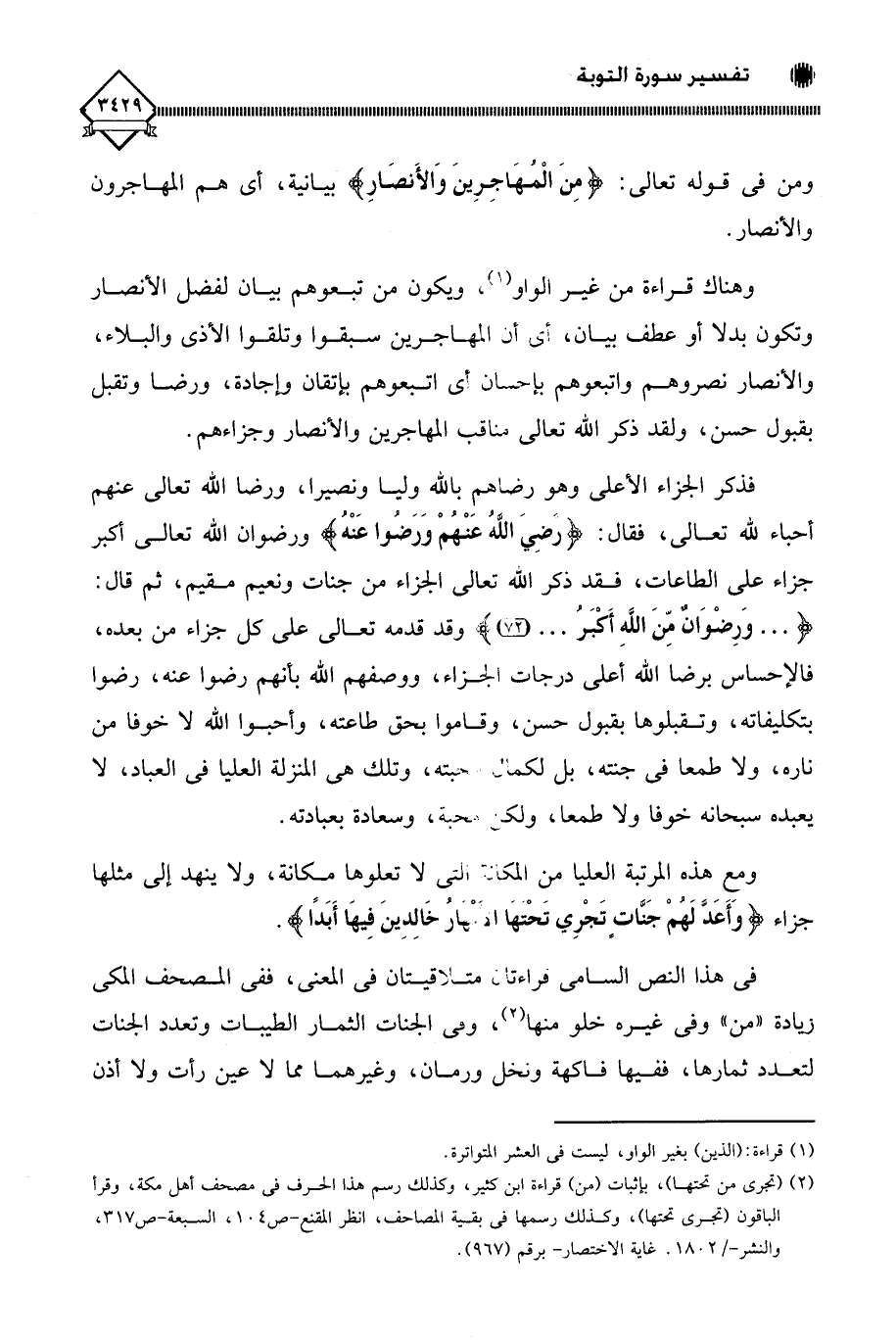 (¬2) (تجري من تحتها)، بإثبات (من) قراءة ابن كثير، وكذلك رسم هذا الحرف في مصحف أهل مكة، وقرأ الباقون (تجري تحتها)، وكذلك رسمها في بقية المصاحف، انظر المقنع - ص 104، السبعة - ص 317، والنشر - / 1802. غاية الاختصار - برقم (967).