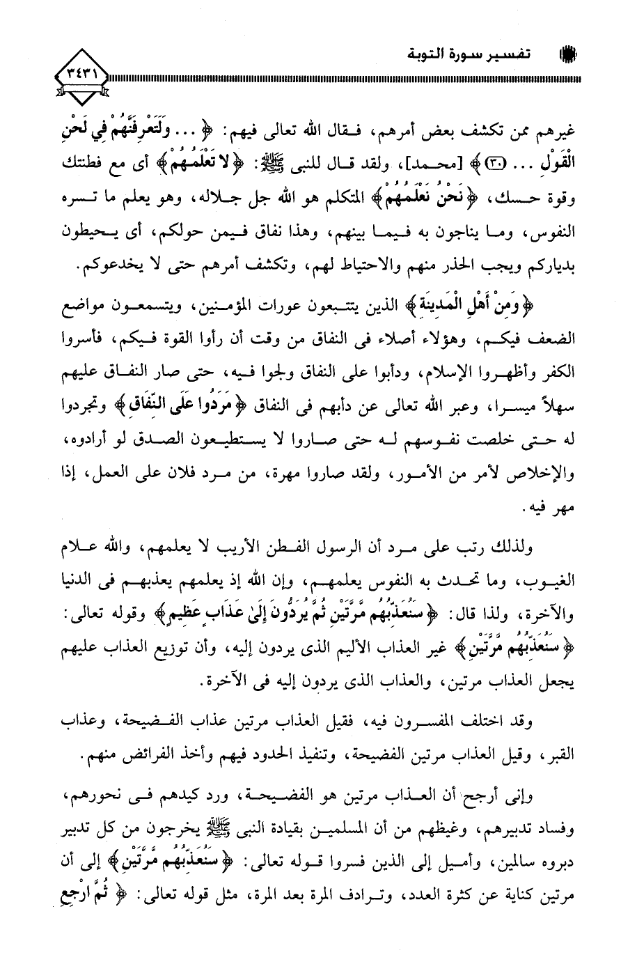 ولذلك رتب على مرد أن الرسول الفطن الأريب لَا يعلمهم، والله علام الغيوب، وما تحدث به النفوس يعلمهم، وإن الله إذ يعلمهم يعذبهم في الدنيا والآخرة، ولذا قال: (سَنُعَذِّبُهُمْ مَرَّتَيْنِ ثُمَّ يُرَدُّونَ إِلَى عَذَابٍ عَظِيمٍ) وقوله تعالى: (سَنُعَذِّبُهُمْ مَرَّتَيْنِ) غير العذاب الأليم الذي يردون إليه، وأن توزيع العذاب عليهم يجعل العذاب مرتين، والعذاب الذي يردون إليه في الآخرة.