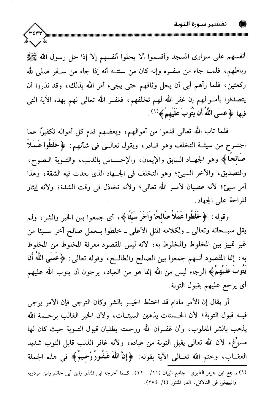 وقوله: (خَلَطُوا عَمَلًا صَالِحًا وَآخَرَ سَيِّئًا)، أي جمعوا بين الخير والشر، ولم يقل سبحانه وتعالى - ولكلامه المثل الأعلى - خلطوا بعمل صالح آخر سيئا من غير تمييز بين المخلوط والمخلوط به؛ لأنه ليس المقصود معرفة المخلوط من المخلوط به، إنما المقصود أنهم جمعوا بين الصالح والطالح، وقوله تعالى: (عَسَى اللَّه أَن يَتُوبَ عَلَيْهِمْ) الرجاء ليس من الله إنما هو من العباد، يرجون أن يتوب الله عليهم أي يرجع عليهم بقبول التوبة.
