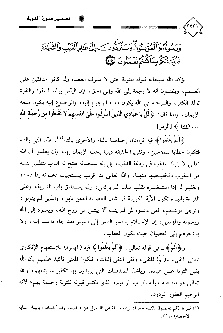 (أَلَمْ يَعْلَمُوا) فيه قراءتان إحداهما بالياء والأخرى بالتاء (¬1)، فأما التي بالتاء فتكون خطابا للمؤمنين، وتقريرا لحقيقة دينية يجب الإيمان بها، وأن يعلموا أن الله تعالى لَا يترك المذنب في ردغة الذنب، بل إنه سبحانه يفتح له الباب لتطهير نفسه من الذنوب وتخليصها منها، والله تعالى منه قريب يستجيب دعوته إذا دعاه، ويغفر له إذا استغفره بقلب سليم لم يركس، ولم يستغلق باب التوبة، وعلى القراءة بالياء تكون الآية الكريمة في شأن العصاة الذين تابوا، والذين لم يتوبوا، وترجى توبتهم، فهي دعوة لمن لم يتب ألا ييئس من روح الله، ويعود إلى الله ورسوله والمؤمنين، إن الإسلام يستجر الناس إلى الخير فقد جاء داعيا إليه، ولا يستجرهم إلى العصيان حيث يكون العقاب.