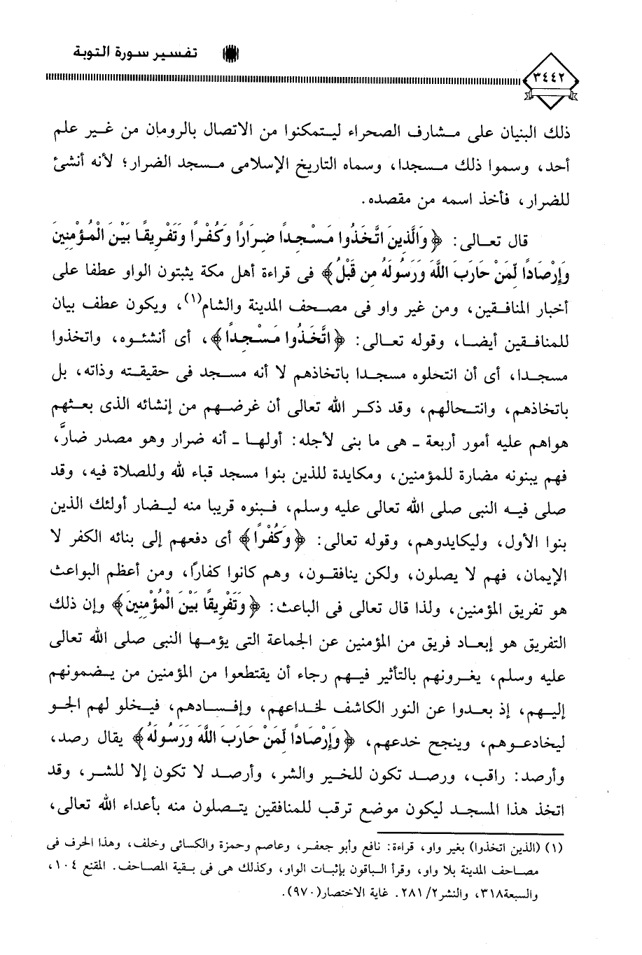 (وَالَّذِينَ اتَّخَذُوا مَسْجِدًا ضِرَارًا وَكُفْرًا وَتَفْرِيقًا بَيْنَ الْمُؤْمِنِينَ وَإِرْصَادًا لِمَنْ حَارَبَ اللَّهَ وَرَسُولَهُ مِنْ قَبْلُ) في قراءة أهل مكة يثبتون الواو عطفا على أخبار المنافقين، ومن غير واو في مصحف المدينة والشام (¬1)، ويكون عطف بيان للمنافقين أيضا، وقوله تعالى: (اتَّخَذُوا مَسْجِدًا)، أي أنشئوه، واتخذوا مسجدا، أي أن انتحلوه مسجدا باتخاذهم لَا أنه مسجد في حقيقته وذاته، بل باتخاذهم، وانتحالهم، وقد ذكر الله تعالى أن غرضهم من إنشائه الذي بعثهم هواهم عليه أمور أربعة - هي ما بني لأجله: أولها - أنه ضرار وهو مصدر ضارَّ، فهم يبنونه مضارة للمؤمنين، ومكايدة للذين بنوا مسجد قباء لله وللصلاة فيه، وقد صلى فيه النبي صلى الله تعالى عليه وسلم، فبنوه قريبا منه ليضار أولئك الذين بنوا الأول، وليكايدوهم، وقوله تعالى: (وَكفْرًا) أي دفعهم إلى بنائه الكفر لا الإيمان، فهم لَا يصلون، ولكن ينافقون، وهم كانوا كفارًا، ومن أعظم البواعث هو تفريق المؤمنين، ولذا قال تعالى في الباعث: (وَتَفْرِيقًا بَيْنَ الْمُؤْمِنِينَ) وإن ذلك التفريق هو إبعاد فريق من المؤمنين عن الجماعة التي يؤمها النبي صلى الله تعالى عليه وسلم، يغرونهم بالتأثير فيهم رجاء أن يقتطعوا من المؤمنين من يضمونهم إليهم، إذ بعدوا عن النور الكاشف لخداعهم، وإفسادهم، فيخلو لهم الجو ليخادعوهم، وينجح خدعهم، (وَإِرْصَادًا لِمَنْ حَارَبَ اللَّهَ وَرَسُولَهُ) يقال رصد، وأرصد: راقب، ورصد تكون للخير والشر، وأرصد لَا تكون إلا للشر، وقد اتخذ هذا المسجد ليكون موضع ترقب للمنافقين يتصلون منه بأعداء الله تعالى،