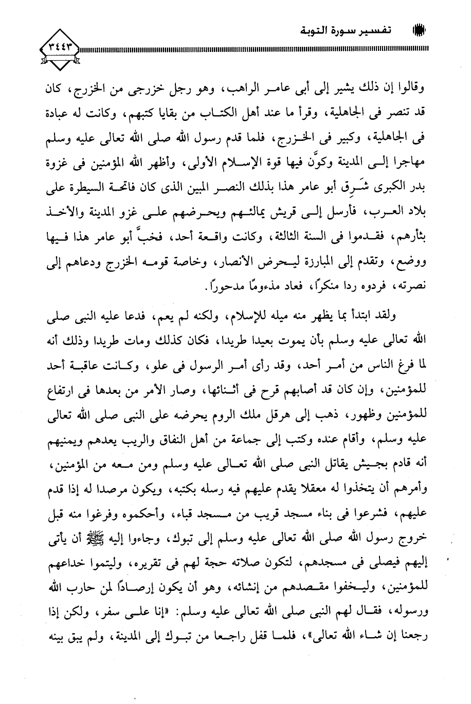 ولقد ابتدأ بما يظهر منه ميله للإسلام، ولكنه لم يعم، فدعا عليه النبي صلى الله تعالى عليه وسلم بأن يموت بعيدا طريدا، فكان كذلك ومات طريدا وذلك أنه لما فرغ الناس من أمر أحد، وقد رأى أمر الرسول في علو، وكانت عاقبة أحد للمؤمنين، وإن كان قد أصابهم قرح في أثنائها، وصار الأمر من بعدها في ارتفاع للمؤمنين وظهور، ذهب إلى هرقل ملك الروم يحرضه على النبي صلى الله تعالى عليه وسلم، وأقام عنده وكتب إلى جماعة من أهل النفاق والريب يعدهم ويمنيهم أنه قادم بجيش يقاتل النبي صلى الله تعالى عليه وسلم ومن معه من المؤمنين، وأمرهم أن يتخذوا له معقلا يقدم عليهم فيه رسله بكتبه، ويكون مرصدا له إذا قدم عليهم، فشرعوا في بناء مسجد قريب من مسجد قباء، وأحكموه وفرغوا منه قبل خروج رسول الله صلى الله تعالى عليه وسلم إلى تبوك، وجاءوا إليه - صلى الله عليه وسلم - أن يأتي إليهم فيصلي في مسجدهم، لتكون صلاته حجة لهم في تقريره، وليتموا خداعهم للمؤمنين، وليخفوا مقصدهم من إنشائه، وهو أن يكون إرصادًا لمن حارب الله ورسوله، فقال لهم النبي صلى الله تعالى عليه وسلم: " إنا على سفر، ولكن إذا رجعنا إن شاء الله تعالى "، فلما قفل راجعا من تبوك إلى المدينة، ولم يبق بينه
