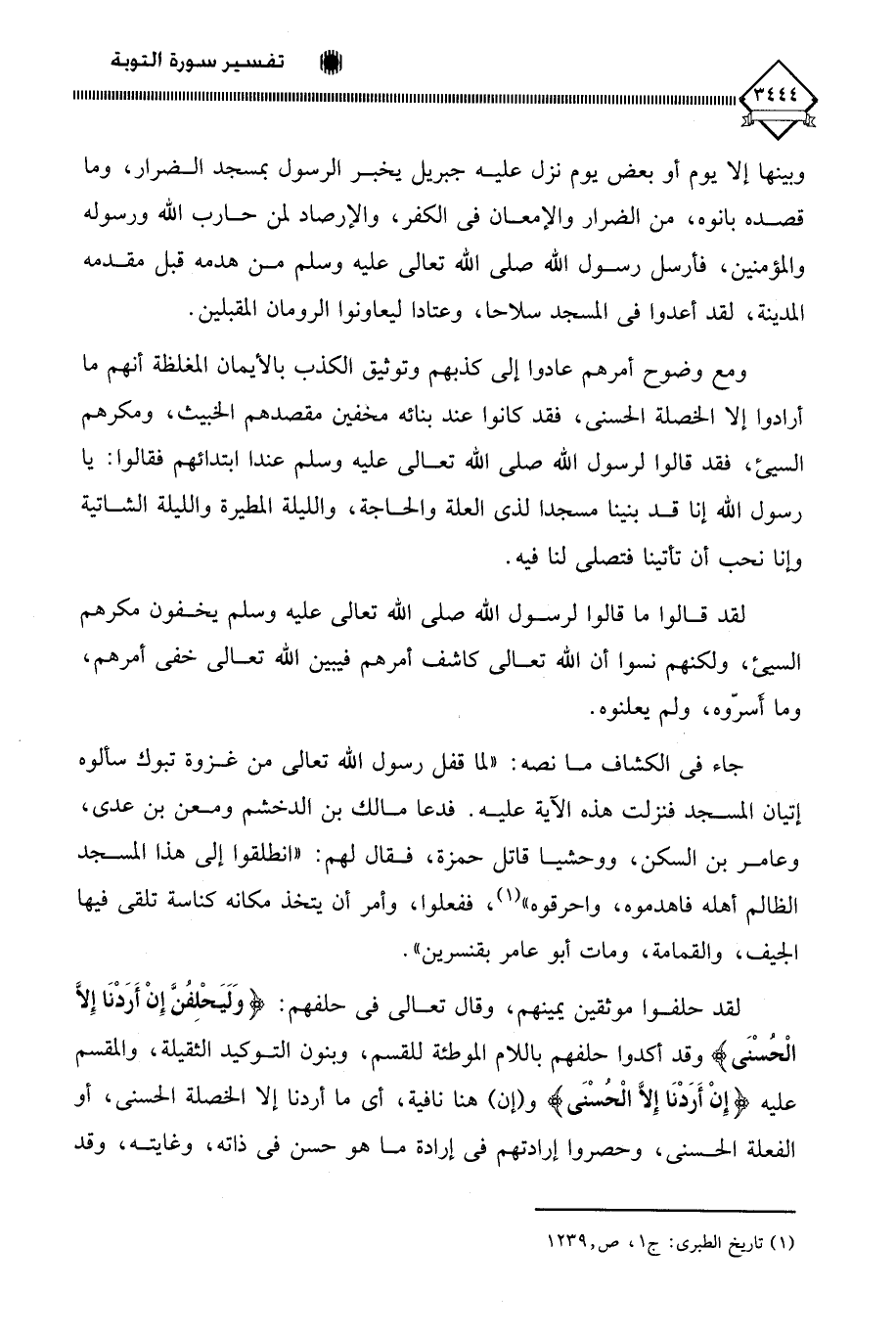 وبينها إلا يوم أو بعض يوم نزل عليه جبريل يخبر الرسول بمسجد الضرار، وما قصده بانوه، من الضرار والإمعان في الكفر، والإرصاد لمن حارب الله ورسوله والمؤمنين، فأرسل رسول الله صلى الله تعالى عليه وسلم من هدمه قبل مقدمه المدينة، لقد أعدوا في المسجد سلاحا، وعتادا ليعاونوا الرومان المقبلين.