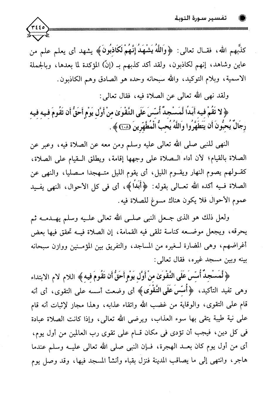 (لَا تَقُمْ فِيهِ أَبَدًا لَمَسْجِدٌ أُسِّسَ عَلَى التَّقْوَى مِنْ أَوَّلِ يَوْمٍ أَحَقُّ أَنْ تَقُومَ فِيهِ فِيهِ رِجَالٌ يُحِبُّونَ أَنْ يَتَطَهَّرُوا وَاللَّهُ يُحِبُّ الْمُطَّهِّرِينَ (108)